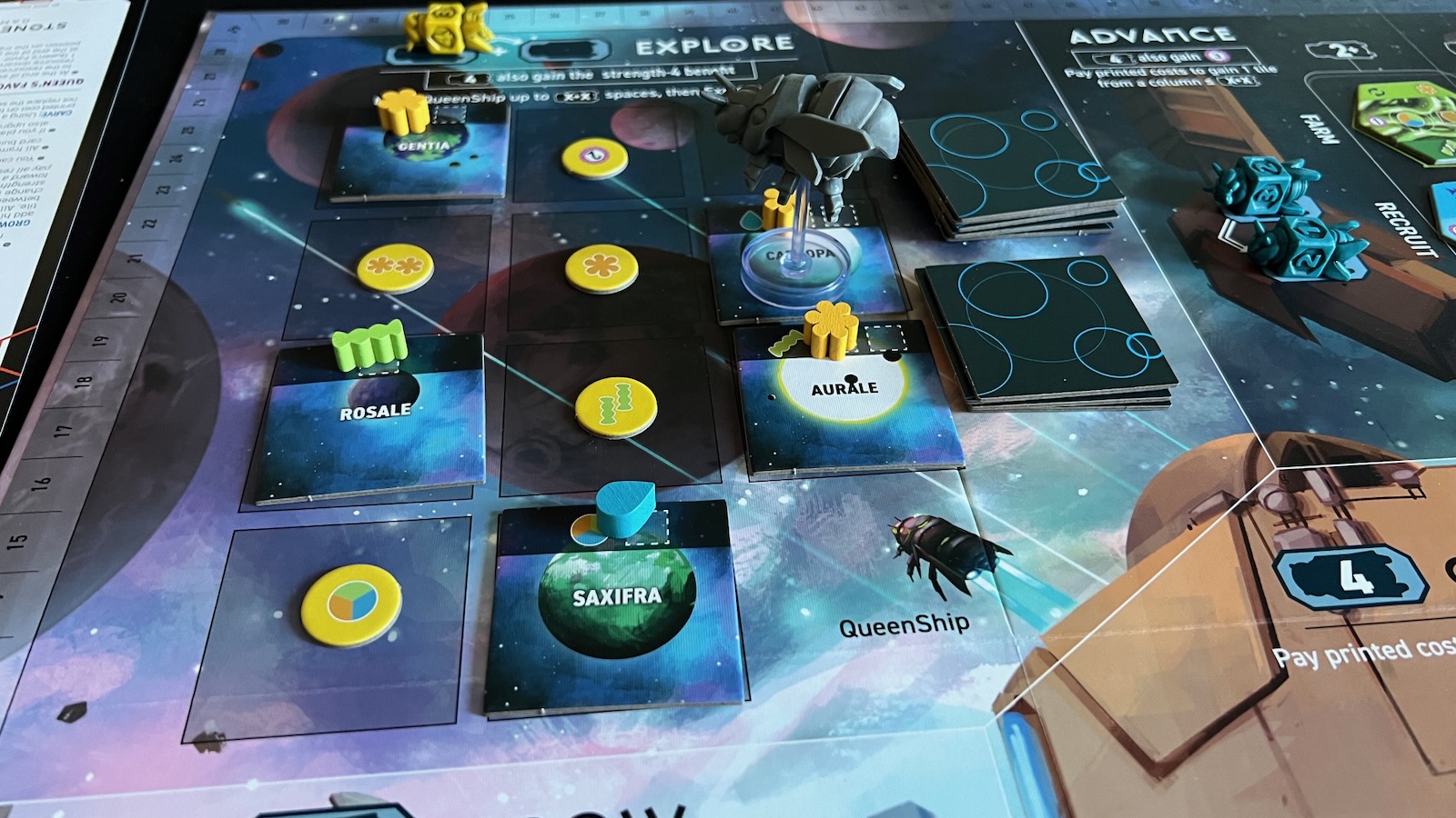 The board is laid out nicely and easy to read through the instructions and symbols printed on the board. The board is modified on each side for player count that slightly alters the available spaces. The biggest difference between the two sides is in the Advance section when gaining tiles. Players are given two different places to place bees on the 4-5 player side: one referring to the farm tiles and the other referring to the scout and development tiles. This definitely changes the strategy a bit with different player counts. The other areas of the board just feature less spaces to hold tiles such as planet tiles in the Explore area, less available Carve tiles, less dances available in the Convert section, and changes to the Hibernation Core.