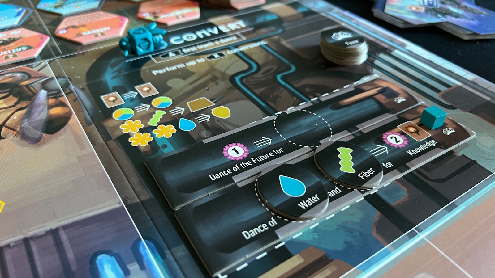The last area of the board is the Convert section, which is basically an exchange market. In this area, players can make a number of exchanges based on the strength of their bee worker. This area allows one-for-one exchanges of seed cards and basic resources, as well as exchanging combinations of basic resources for the premium wax and honey resources. If a player places a strength 4 bee, they can teach a dance. Dance tiles are new exchanges created by the active player. Players will add dance tokens to the dance tiles which represent things like Queen’s Favor points, basic resources, and end game points. The placement of these tiles will create a unique exchange rate and bonus that all players can utilize for the remainder of the game. The active player will also place a cube on the dance which will gain them the queen’s favor whenever another player uses the dance in future turns.