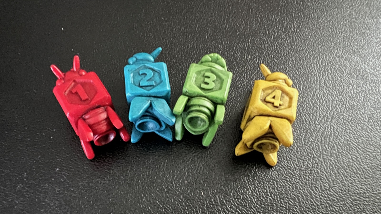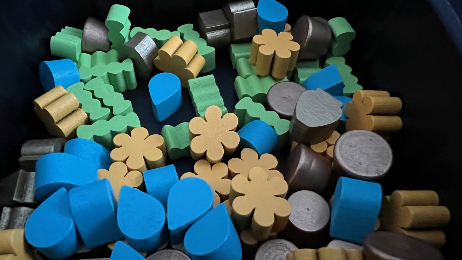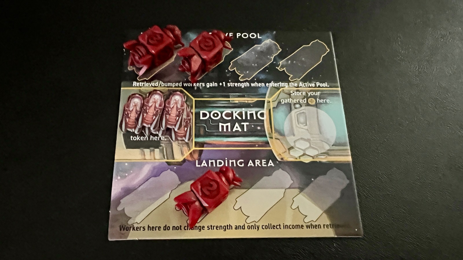 The production quality of this game is in line with the standard set by Stonemaier games in the past. The worker bees are a thing of beauty. Each of the pieces feels handmade and has a dark wash to accentuate the intricacies of the bee/spaceship hybrid. In comparison, the queen bee mother ship feels a little cheap and plastic, but the design of the ship is exceptional. The resource tiles are of high quality, vibrantly colored, and inspired more than one desire for a rolo candy when gaining wax.