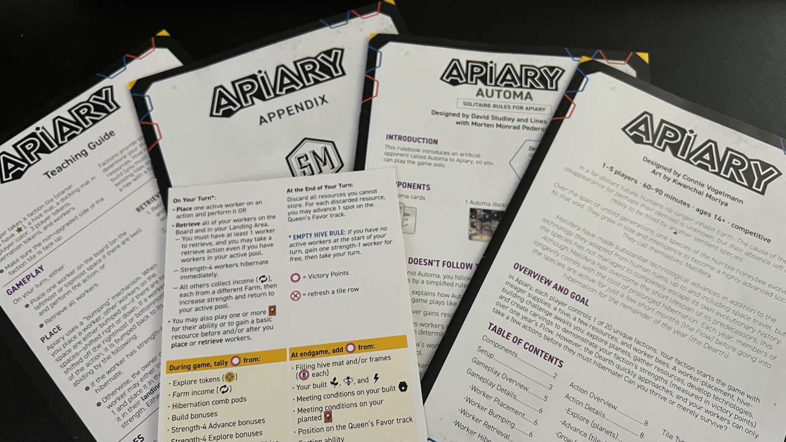 Apiary comes with four different rule books and supplements to help players learn the game.