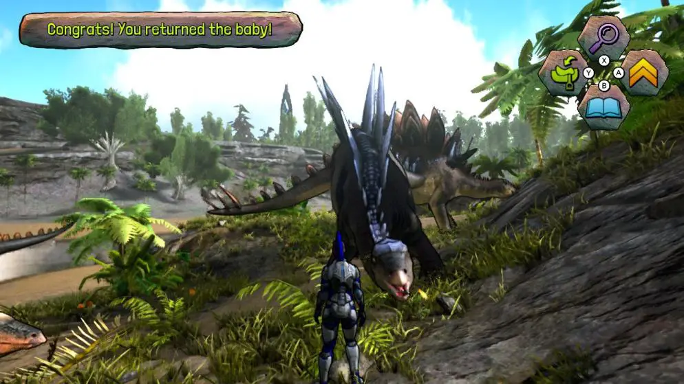 Let’s take a minute now to discuss the addition to ARK that I was excited about, considering I have nephews and nieces. ARK Dinosaur Discovery is an additional game (which you’ll need to search for separately from the base ARK game in the Eshop) that allows kids to experience ARK without the fear of dying or being attacked. You’re able to pick a character from their list of characters. I picked the inflatable T-Rex suit, and ran around on The Island meeting all of the cast of dinosaurs included in the game. Every time you meet a dinosaur you can hear a fully voiced explanation of what the dinosaur is, what they’re known for, and other fun facts. This is such a sweet version of ARK to let your whole family play together. You can also play the entire game with one joy-con. I loved the inclusion of the ARK Dinosaur Discovery and really want people to be able to find it when they buy the Ultimate Survivor Edition. So, make sure you download it from the Eshop.
