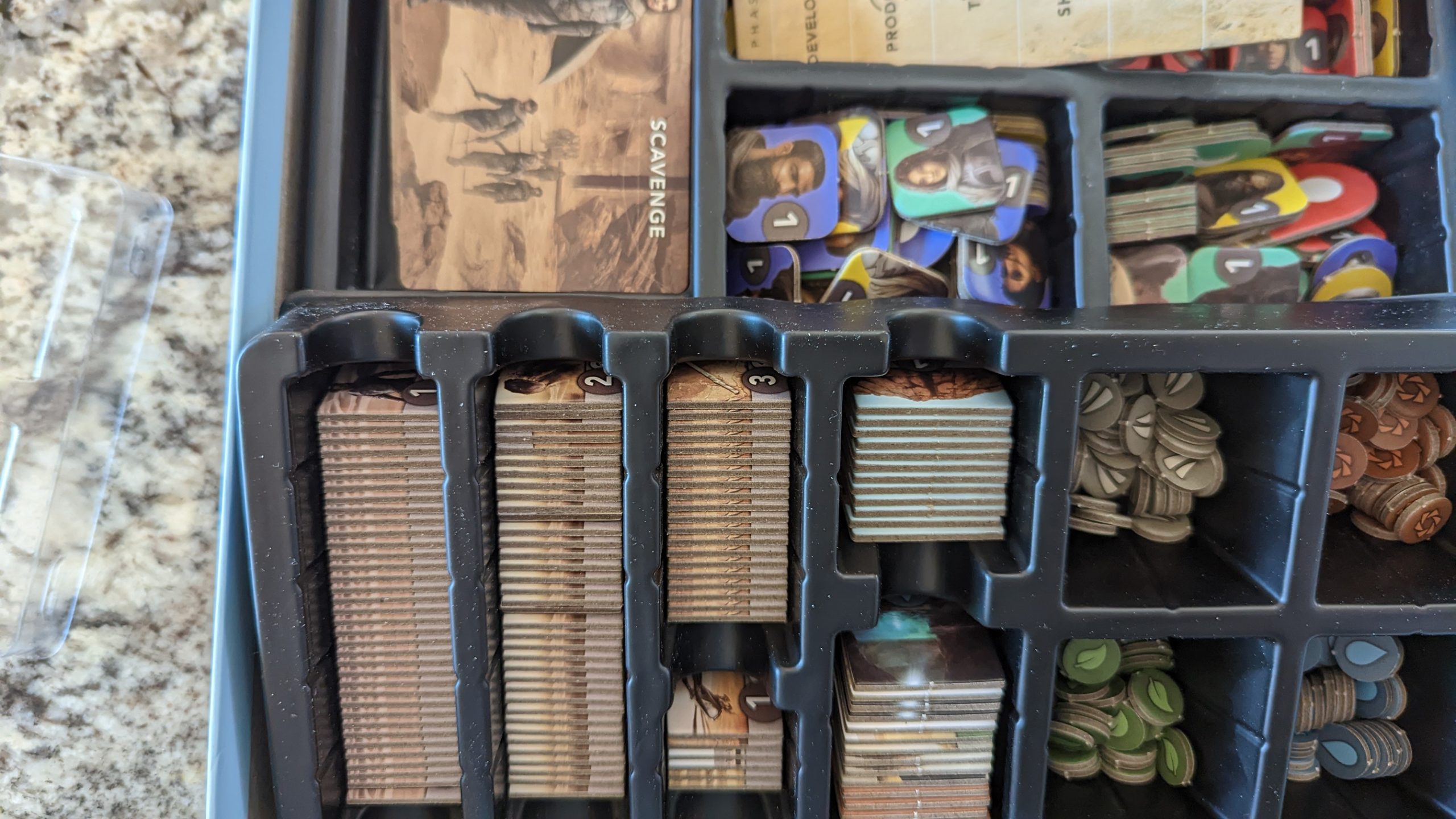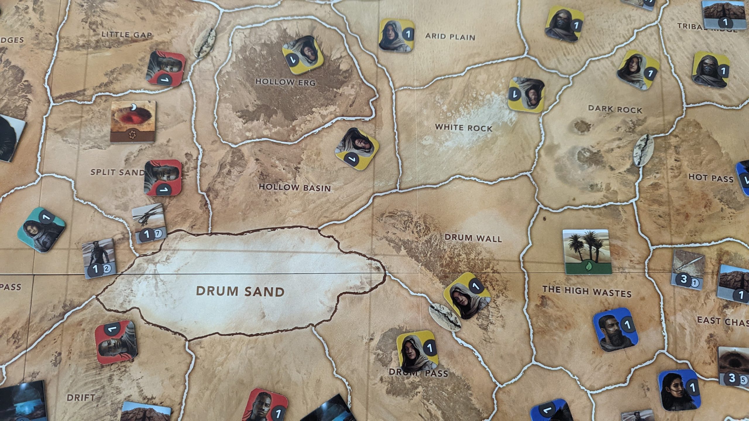 In a way, my optimism was validated- there are some really cool ideas in this box, especially with the standout water debt mechanic. As players jostle for the resources and production sites that will allow them to build the all-important sietches that double resource production and ultimately give them the win, territories and the tokens inside them will inevitably change ownership. In most area control games, losing territory is a painful experience, and while Arrakis is no exception, offenders have to provide their victims with water debt tokens as a salve. And a potent salve they are, as water debt is the most versatile and unconditionally useful mechanic I’ve ever seen. These tokens can be returned to stop their owner from attacking, or to ignore hostile regions for your own attack deep into their territory. They can even be turned in to generate resources. Of course, as valuable as they are, they can also be used as a hot commodity in trades with other players. But water debt isn’t the only neat idea in Arrakis. Remember those resources you’re going to be fighting over? They don’t just magically teleport to some resource pool when they’re produced. Instead, they pop out on the same map region as their production site, and a fair amount of the game is working out the logistics of getting stuff where it needs to be to be converted into the bevy of development tiles. I was also initially enticed by the variable map setup, where rock faces make some borders harder than others, production sites are distributed randomly, and then players draft starting regions. The good stuff here isn’t just mechanics- Arrakis has the best first-party insert I’ve seen outside of Twilight Imperium. Otherwise, I’d describe the production as adequate- the punchboard is thick enough, and the cards don’t feel flimsy, but there’s nothing to write home about or impress anybody.