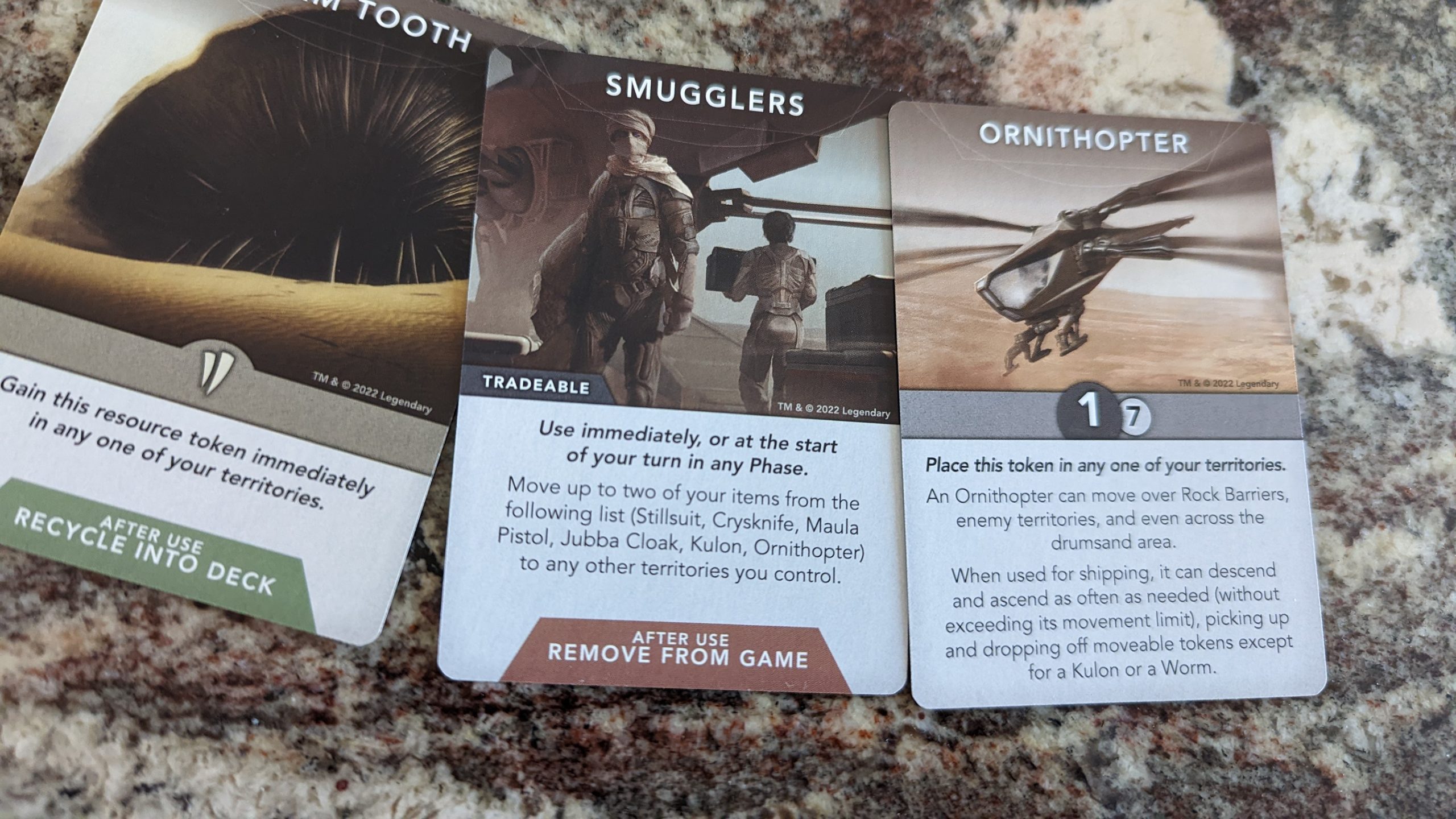 Which brings us to the action phase, where players can choose to attack or draw cards from the scavenge deck. Attacking seems simple enough: you just place the attack token in the region you wish to attack. Instead it’s another unfortunate combination of interpreting vague rules and deciphering opaque board states. The attacker makes one movement into the indicated region, with the option to pick up, but not drop off, tokens along the way. Then players’ combat strength is calculated by adding their tokens in that region to their tokens in adjacent regions, with the exception of those separated by rock barriers, with the secondary exception of those containing kulon tokens. Somewhere along the line, the defender can drop two of the attacker’s water debts into the region to stop the attack, but the timing for that, and what one does with them afterwards, is unclear. If this happens, or the defender wins, the attacker is free to attack a different region, or scavenge instead, but once again, the rulebook doesn’t explain what happens to the tokens the attacker moved in. I assumed that the defender just gets them, but any clarity whatsoever would be appreciated. Moving on to the scavenge deck, it may be the most high-variance mechanic I’ve ever seen in a board game. The cards you draw can give you anything from a single resource to an ornithopter, which has seven movement and ignores all movement restrictions, making the logistics puzzle of getting the resources you want where you want them obsolete.