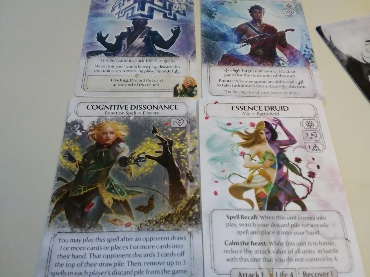 Both decks have a ton of utility, managing to be internally consistent and to grant a ton of new options to existing Phoenixborn. James’ deck is Ceremony/Divine, while Fiona’s is Charm/Symphony. Even leafing through these cards for the first time, my head was swimming with additions I could make to existing decks, while performing well within their own decks.