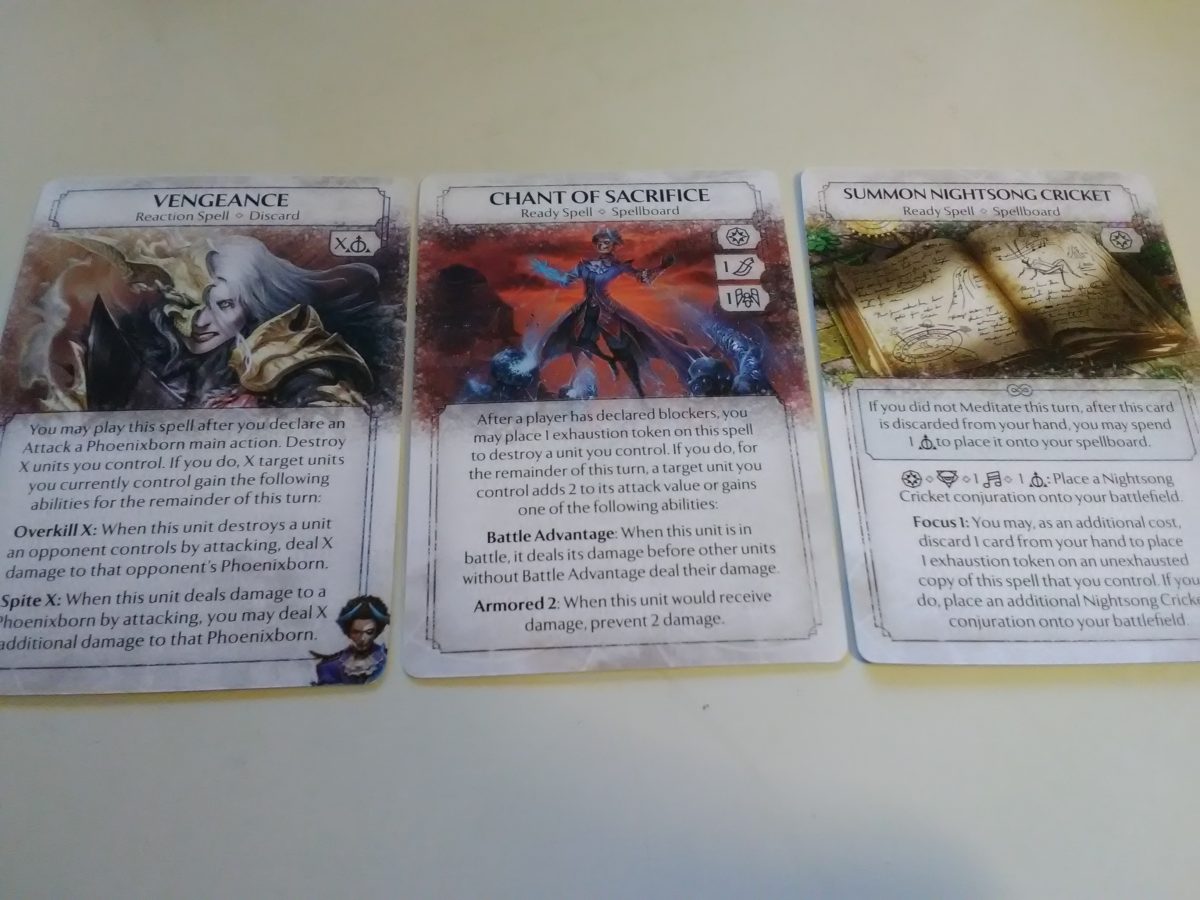 There is an overall issue which has occasionally poked its head out from time to time and unfortunately returns in these final decks: cards with far too much text. Yes, it’s necessary for some of the fascinating interactions that Ashes creates, especially as Plaid Hat works more and more to maximize every piece of the game’s design space, but a surprising proportion of these cards are covered in text that explain their effects and conditions. While I actually like the individual cards a lot, this creates a few issues. First and foremost is that the increase in text leads to a (minor) decrease in text size. This combined with the many lines contained within each paragraph make the physical act of reading the cards more difficult. Furthermore, each card brings with it a lot to keep in mind, between the conditions, uses, and associated costs. Understanding them for the first time can be cumbersome, but referencing them in game (when the inevitable rules issue arises) brings the game to an inordinately long halt. Finally, there is a good chance that with four other cards in your hand and plenty on the table, you’ll simply lose track of all of your options. As an example, take a quick look at Summon Night Song Cricket and a few of James’ cards.