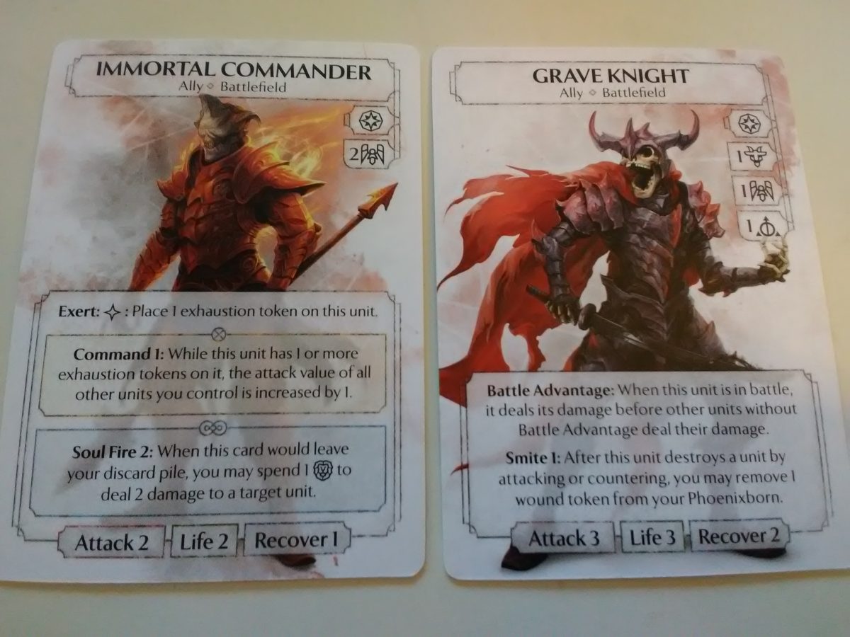 The Grave King has a limited spellboard at 3, which will force some harsh deckbuilding choices, but his ability to pull allies from the draw pile makes his focus more clear, not to mention a battlefield of 7. With a number of ways to put allies in your discard pile, as well as allies that want to go there, you’ll be chaining a lot of units into and out of the grave. All the while his spells give him a number of benefits for sacrificing units. Despite a few powerhouses that have a ton of utility (gaze in awe at Immortal Commander below), my personal favorite is Rising Horde and the Fallen they create (also below). For two dice, you get three units that you can easily use to attack, block, or sacrifice as necessary. Because the Horde has one life, you can use James’ side action ability to pull them from your deck and summon them in the same turn. Now look back at Immortal Commander and think about the kind of power he could put out with them.