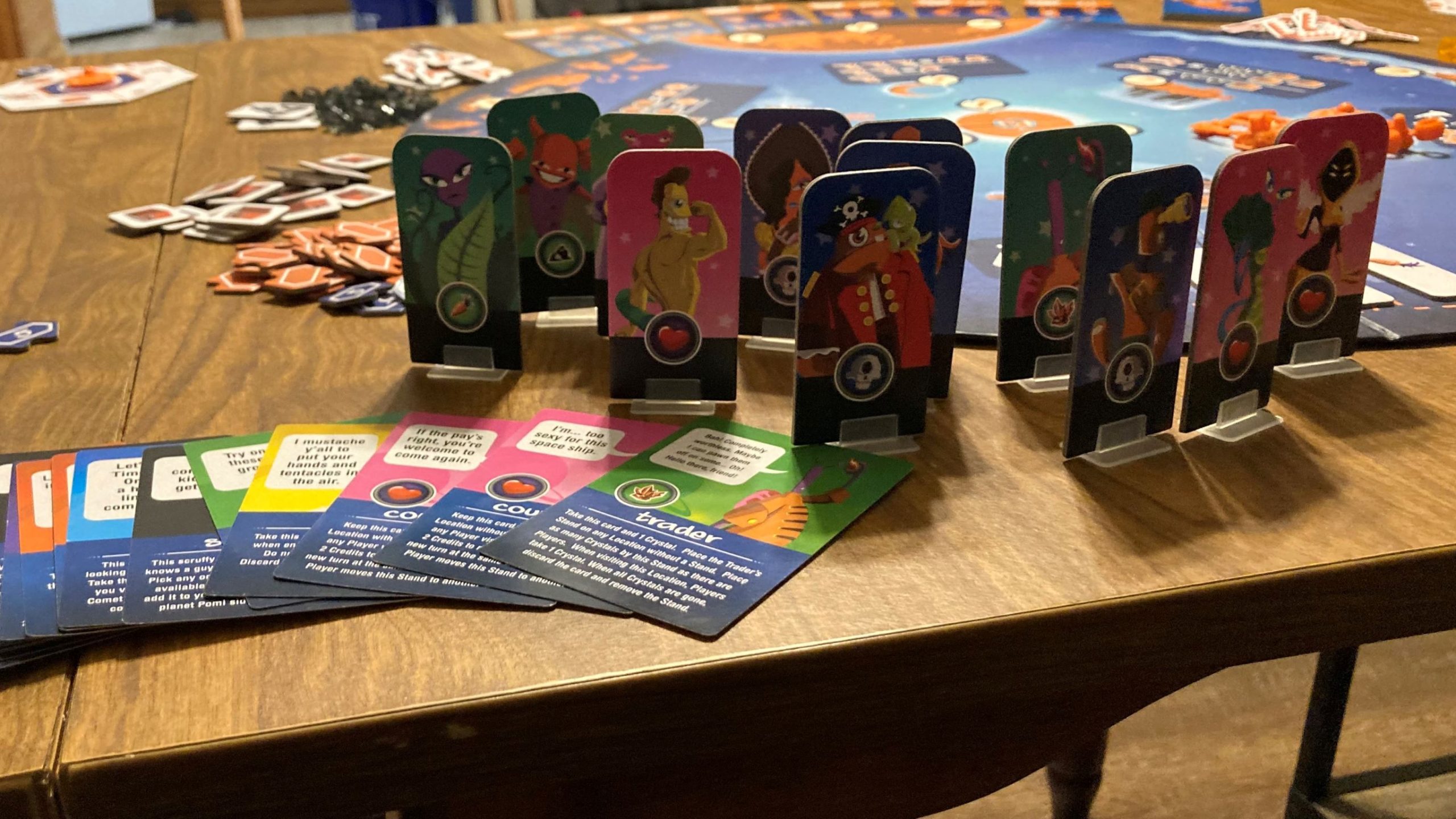 The game’s locations allow you to collect resources such as space slugs, crystals, ore, and space carrots or take cards from the game’s RiffRaff deck. Those cards can help you by allowing you to move your ship again (action economy!) or even place characters such as pirates, merchants, or courtesans that allow for you to take a second turn at a location in exchange for some credits. Yeah, they went there.