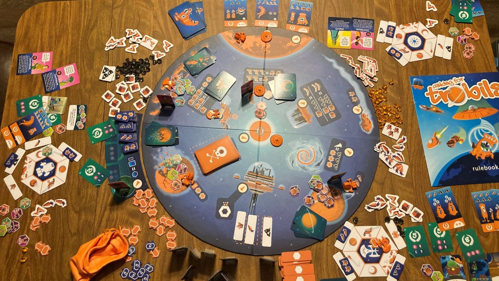 Asking For Trobils set up with the Trobil Makers expansion mid-game showing the amount of resources and Trobots across the board and table