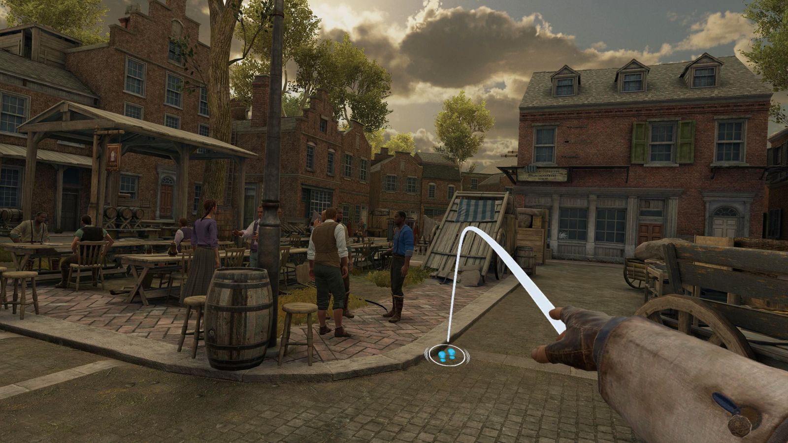 Not every activity requires bouncing around on the rooftops – there’s plenty of things to do at ground level. Lockpicking is very tactile as you slowly rotate rings into each other, the pins falling into place. As you twist the controllers it all feels very familiar but VR is just somehow cooler. Similarly, getting the attention of guards by making the whistling motion with your thumb and index finger and then actually whistling is just pure fun. After roughly two hours you’ll get the chance to start easing folks of their burdens with a little bit of pickpocketing. It works very similarly to the way it works in Assassin’s Creed: Mirage. You can even throw dice with some famous folks, strum or blow into any instrument you find, and interact with most everything that seems relevant to do so. It doesn’t feel haphazard, instead making the world feel more alive.