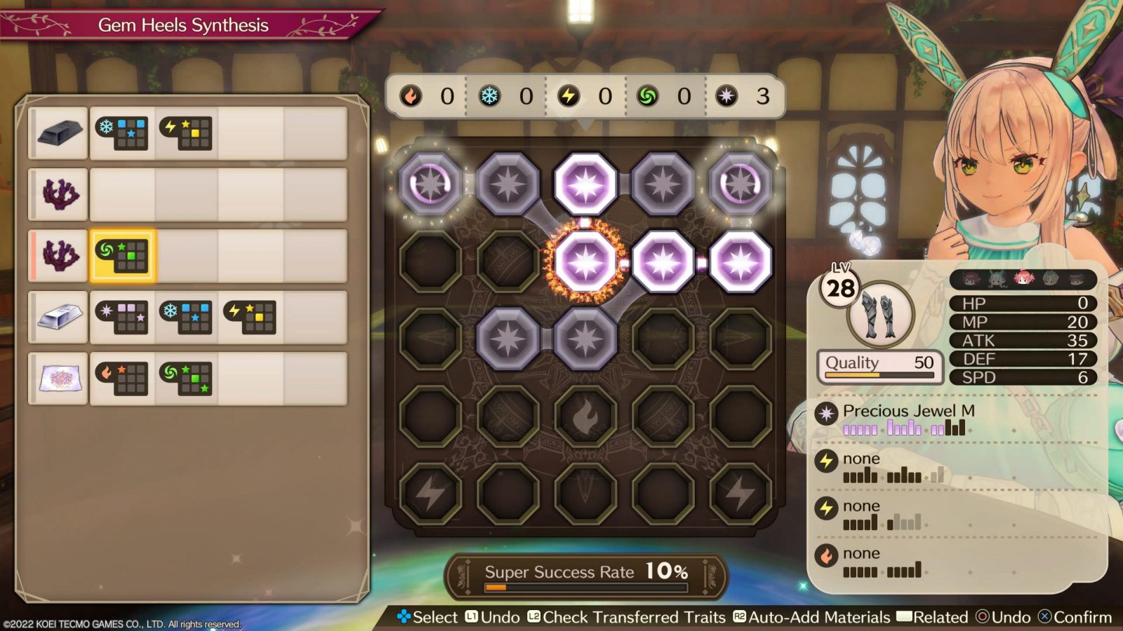 Every single ingredient has its own attributes and special effects. For example, one stick may have the Cheap effect, which reduces the cost of restocking the created item at a shop, while another will have Attack Charge and MP Max Boost. The former stick would be better suited to creating a consumable item, such as a bomb or healing salve, whille the latter could enhance some equipment to give you an edge in battle. You also have to keep in mind the ingredients elemental attributes. After selecting your components, you place the items into a grid 5×5 grid. Some tiles have elemental bonuses from placing a tile of the corresponding element on top, which in turn will increase the chance of receiving a bonus pertaining to that element seen in the bottom right corner of the screen. You can’t fail this minigame, and can even automate it if you wish, but to get the best results you want to maximize the appropriate elemental affinities, create elemental chains by placing shiny tiles next to each other, and filling out the rows and columns to increase your chance of a Super Success.
