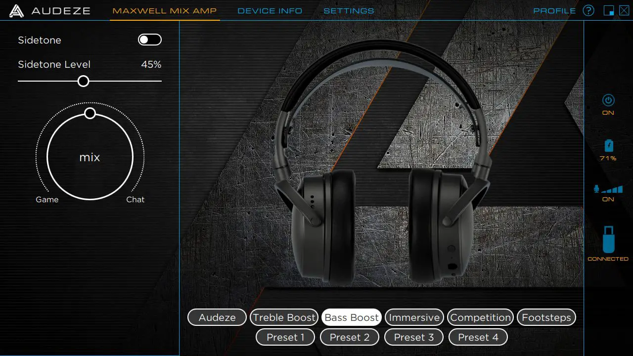 The Audeze HQ app is a little bit barebones, but I like the tools they have inside it. This is available on both PC and phone, with the ability to adjust your game chat mix, enable sidetone (I wouldn’t), and use the included EQ. There are quite a few good ones, like Footsteps and Bass Boost, along with four ten band custom ones you can mess around with on PC or phone. It’s not much, but it’s a nice start.