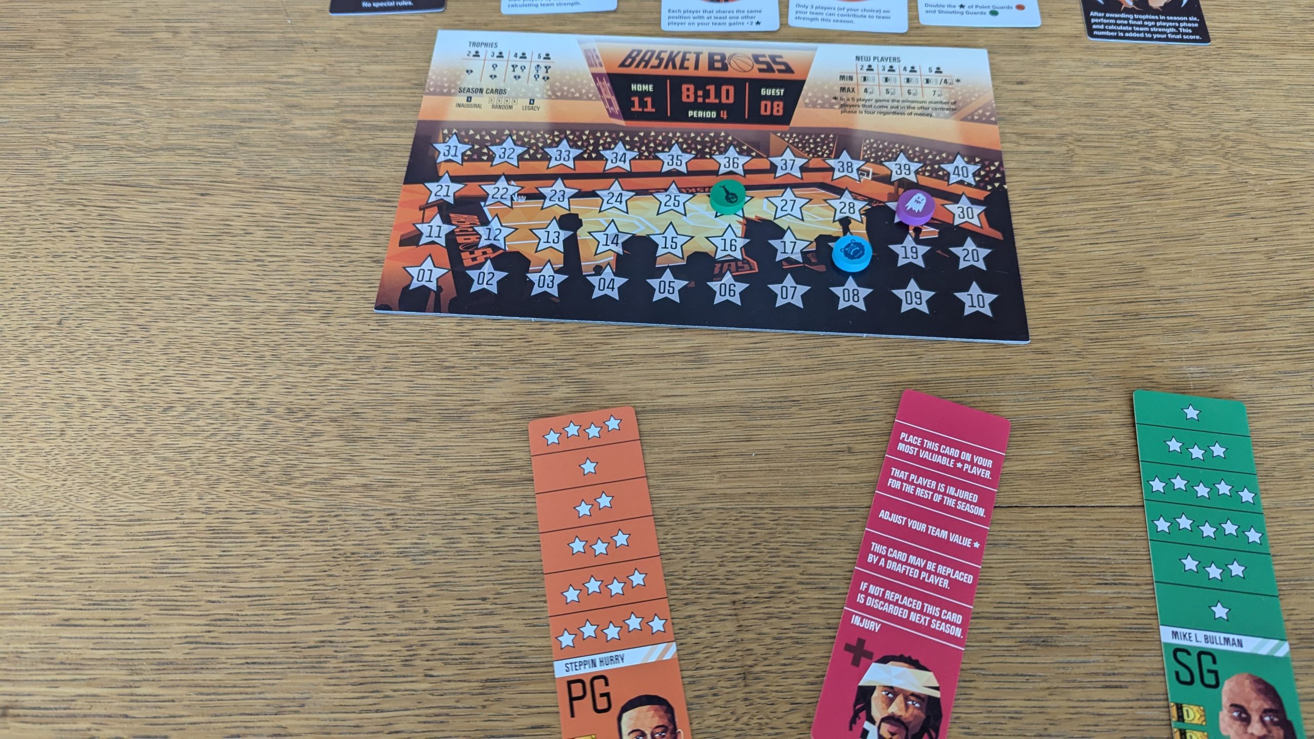 And that brings us to the no, which is mostly that keeping all those disparate mechanics light enough to be palatable in a game of Basketboss’ weight class also keeps any one from shining or being deep enough to sink your teeth into. Instead, they all feel like butter scraped over too much bread. Player attributes are stripped down to just stars; there’s no pursuit of team synergy. Since the order of role drafting is determined by team strength, there’s no way to shape your strategy to use any specific one at any specific time, you just sorta roll with it. Season cards are hit or miss, the Olympics card that limits teams to three players is just a wet blanket, but the ones that double certain positions’ values are game changers. There’s other nitpicks I could point out like the thin shape of the player cards making it a nightmare to shuffle or losing an injury auction and losing your best player for a round being a horrible experience that simultaneously has miniscule gameplay benefit, but I’m rambling.