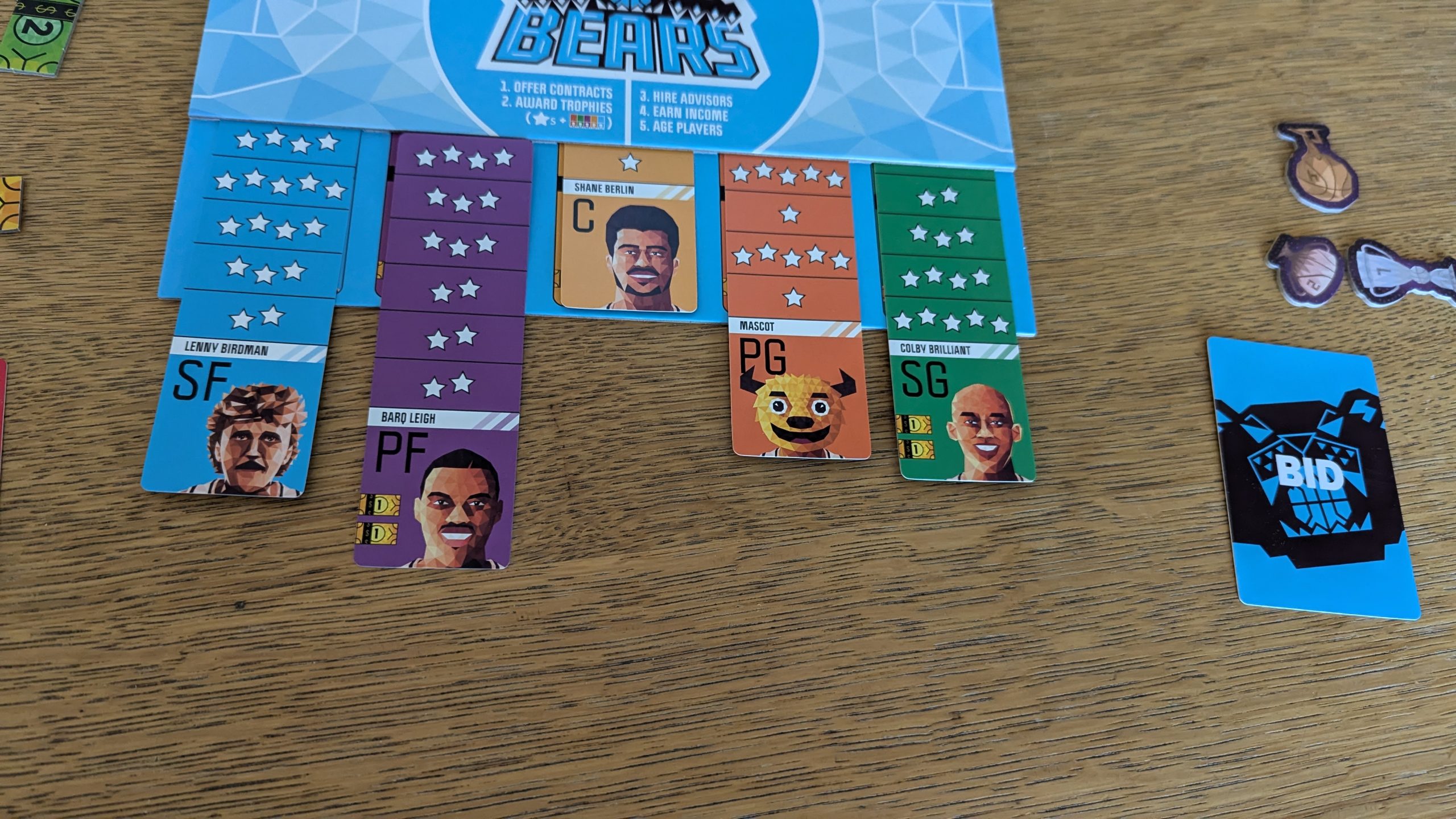 There’s a lot of yes, I really like what’s under the hood here. I love the polygonal art, which brings me back to playing sports video games on early consoles. Basketboss’ big showy draw is its ageing mechanic/gimmick,which has players pushing player cards a step into a slot in their boards during each ageing step, adjusting their star rating. But that’s not the only mechanic players have to wrangle with; income is tied to player and role cards, so while you’re managing the team on the surface you’re also managing your money flow as well. Then there’s the positions, which give you a boost if you diversify. You’ve also got the season cards, which mildly tweak the rules of the game from round to round. Finally, there’s the role cards that players draft each round, which do anything from simultaneously manipulating ageing and letting players out of injury auctions to bestowing a single victory point. All this is light enough that sure, there’s a lot, but it’s also thoroughly grokkable.
