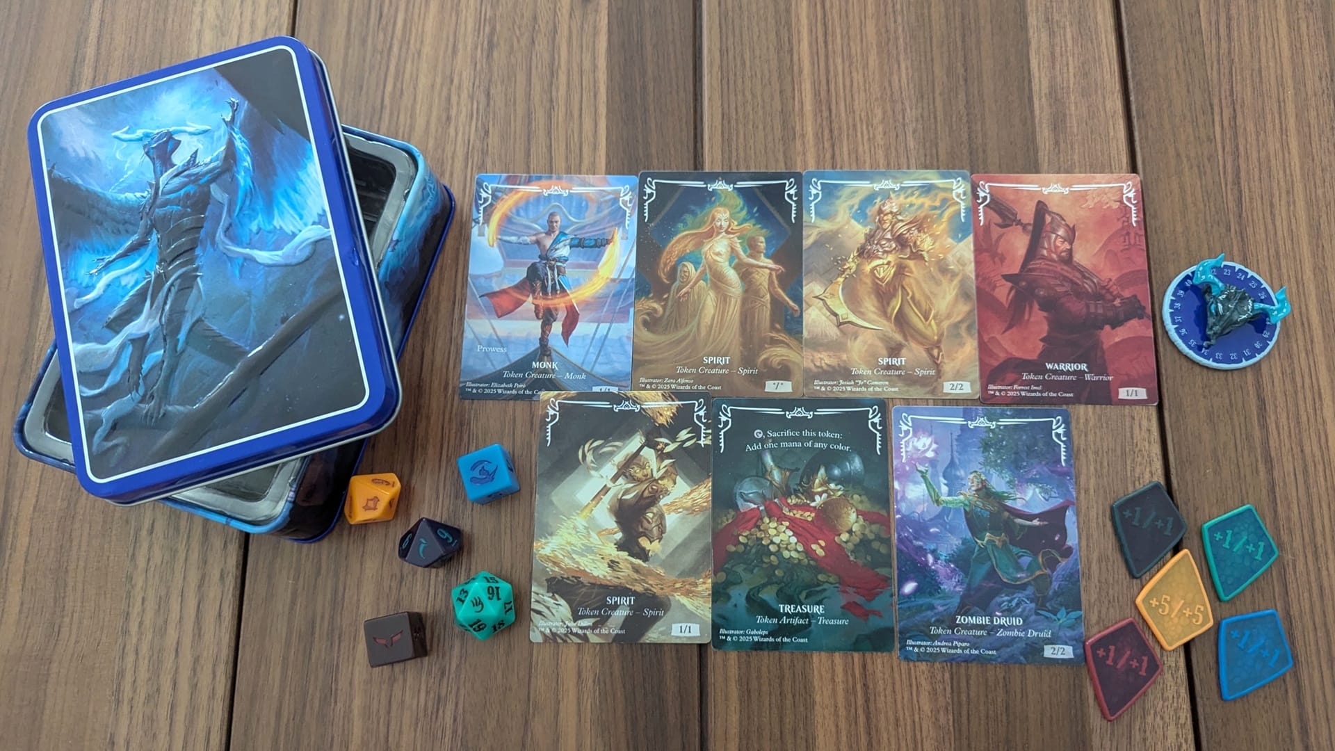 The token set comes inside a tin featuring the artwork of Ugin, Eye of the Storms. The token set contains the following items: an Ugin life counter, five Tarkir-themed dice, seven metal Tarkir tokens, and five +1/+1 (backside is +5/+5) metal counters. Let’s examine these one by one, as I think most of them are great, but I do have some criticisms.