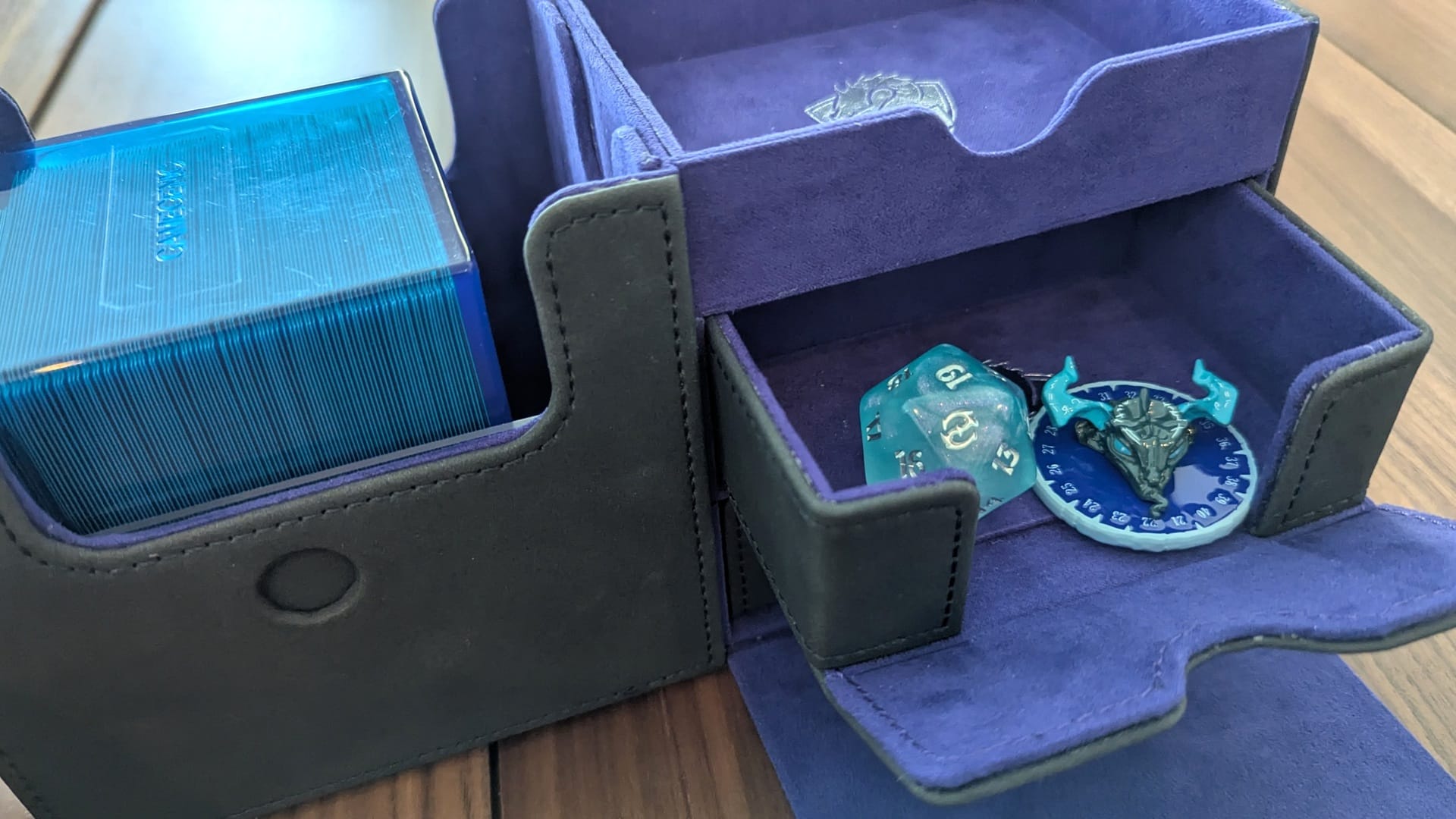 The Ugin life counter inside an Academic Deck Box. The Tarkir Bundle die is not included, but is similar in size.