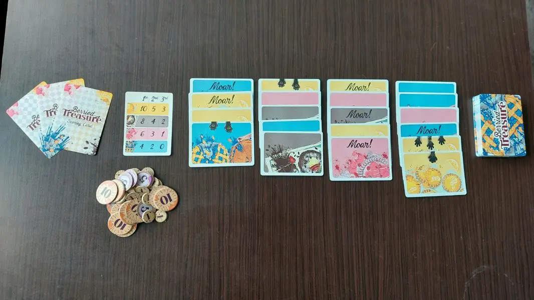 Busting out and explaining this game is lighting fast. To set up, simply shuffle the four score cards and flip one face up. Then, shuffle the pie deck and lay out four face-up columns with 4, 5, 5, and 6 cards in that order to make the “bake rack.”