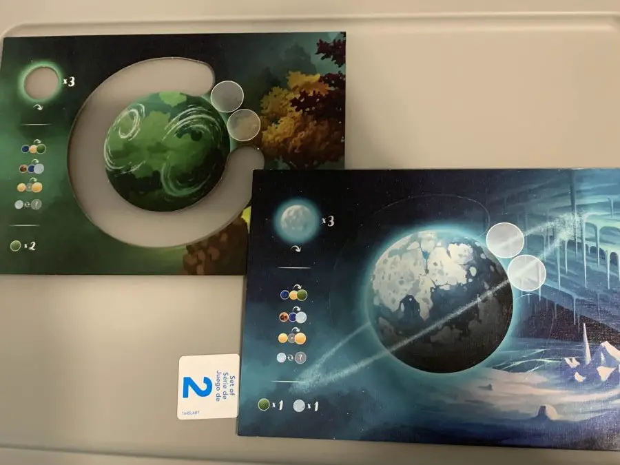 The gameplay loop is extremely simple, and it made learning the game exceptionally easy. When I opened the box the day I got it I only needed 30 minutes to get the rules down and play. I have since played Biomos nearly every morning: The setup of the game makes it easy to unpack in under 5 minutes. As you play the game, you’ll be selecting a terrain token and placing it down, followed by taking two optional actions. You can perform a Planetary event or complete a Biome card. Planetary events let you do things like freezing an Ocean. If you have an Ocean adjacent to a Mountain you can replace the Ocean with a Glacier. Completing a biome consists of you getting points if you have the exact pattern of terrain pieces available. The game ends when the last player completes their Planet Board and after that; the points are tallied.