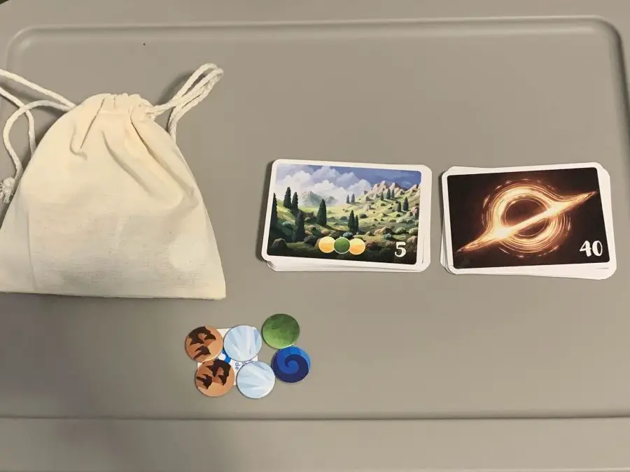 Inside the box, you get 60 terrain tokens, 30 basic biomes, 9 giant biomes, 1 black hole, and 4 planet boards. As a bonus, they also included a cosmic pouch, a bag that holds all the terrain tokens that you’ll be drawing from.