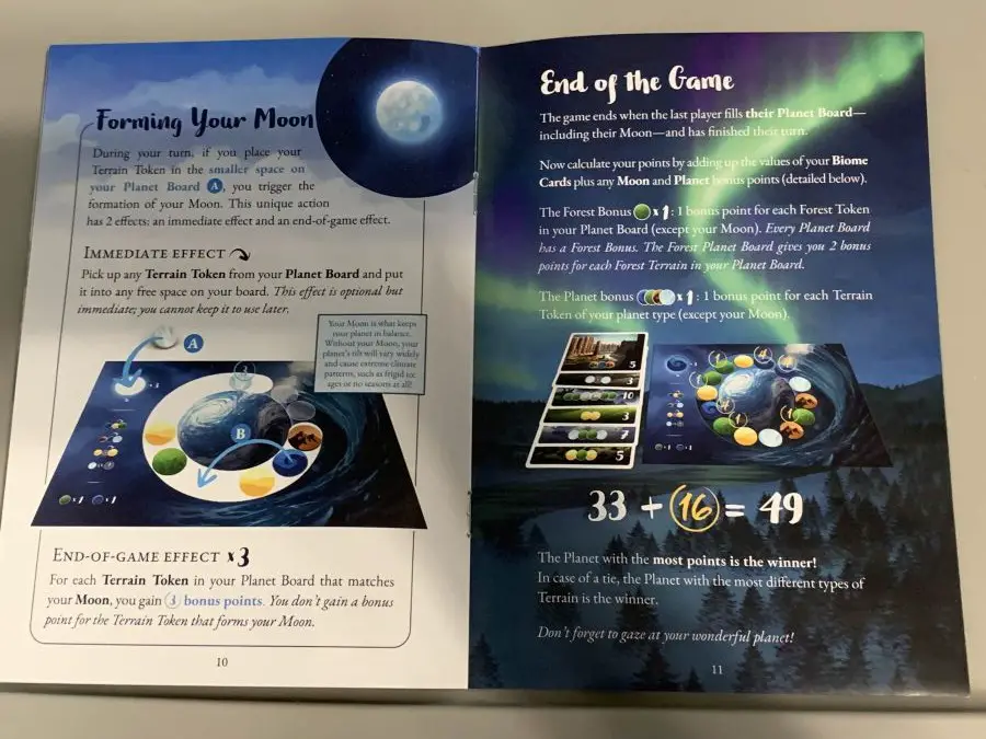 I love the solo mode so much, it’s extremely well done and very fluid. I especially appreciate that the solo rules are not too far apart from the normal rules of the game. Meaning, you can use the rules at the start of the book to set up solo mode. During solo mode, you’re racing against a black hole to finish your biomes: I enjoyed this approach a lot because it makes the game go by much faster. The biggest thing going for solo mode is how well-written the rules are. Everything is as concise as it needs to be to get the point across. I usually steer clear of lightweight games because the instructions can be hit or miss, but this game is an exception to my rule and really showed me how much potential a lightweight game can have.