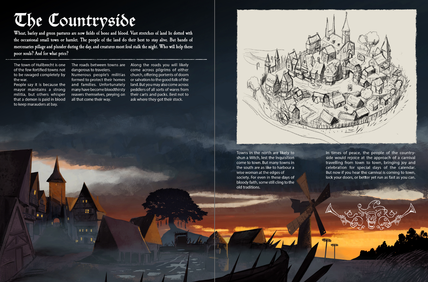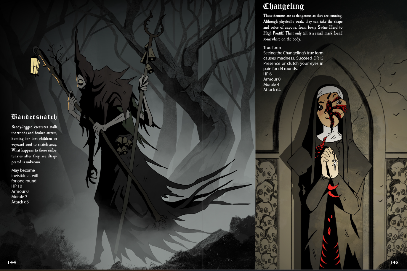 Ben Tobitt’s art truly is exceptional. Its grim, stylized depiction of a late 1600s setting inspired by the Holy Roman empire evokes exactly the right tone. They mix Mork Borg’s outlandish aesthetics with a grounding in folk horror, bringing many MANY character or monster designs that tell wonderful stories all their own. I would love for him to work on a graphic novel or animated film or design a tattoo. Really, anything as an excuse to let him run wild with his skills would be a gift. Anything other than this RPG, that is, because that’s about as far as my complements go.