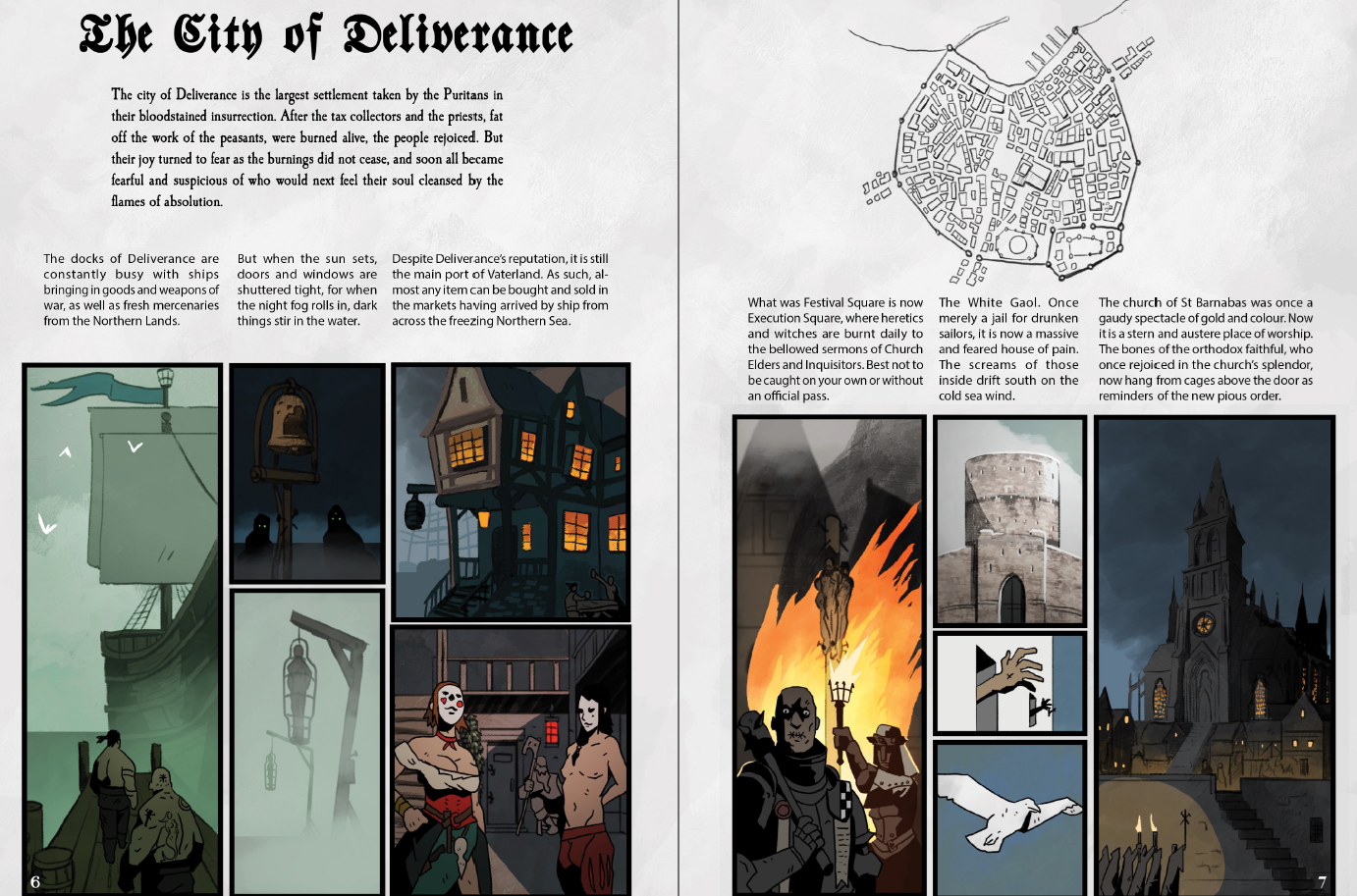 The core book is 191 pages, coming in as the longest Borg-like I can call to mind. (This is compared to Pirate Borg’s 166 pages and Mork Borg’s 88). I read through the PDF, and the length is not helped by the PDF’s inability to search by text. CTRL+F does not work, nor is the one page index hyperlinked. The summary tables in front help get over this issue a lot, but with the number of new or special rules added into the game, that only carries you so far. The setting map carries a parchment aesthetic, which in any other context would be appreciated. Here, the muted colors make deciphering between faction control more painful than it should be for a map.