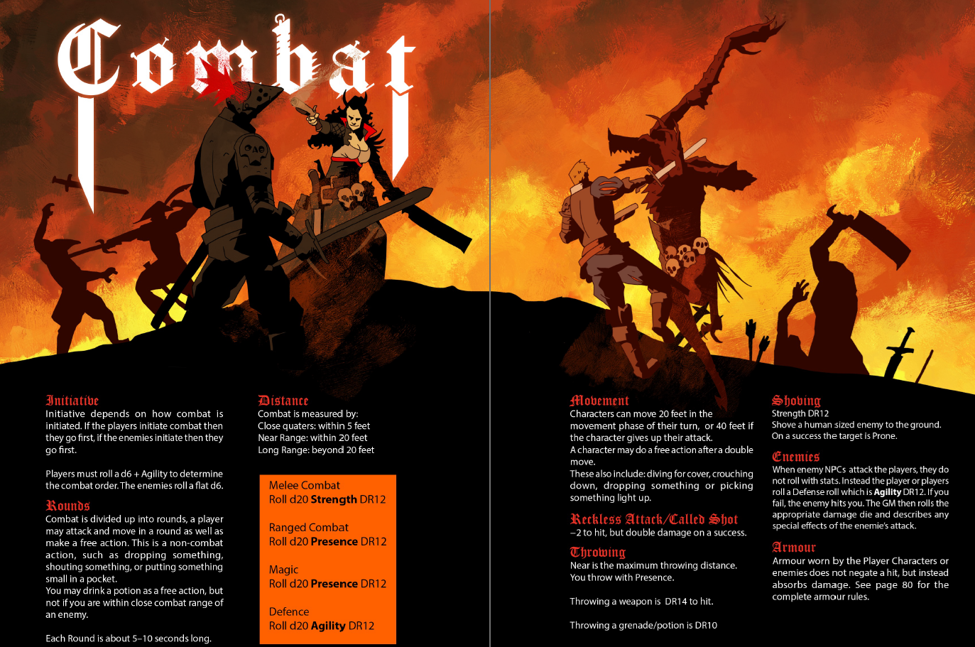 Otherwise, the maneuvers borrow things from 5E like attacks of opportunity and disengaging. The Fire rules say you can do nothing but take d4 damage as you flail and try to put the fire out, but doesn’t explain how you extinguish it. I guess that’s totally narrative? Height advantage states that you get +2 when “shooting and attacking an enemy in range from an elevated position.” How elevated do you need to be? Does that mean when you are shooting as an attack, or shooting or attacking? Grapple allows you to grapple or stun a creature if you succeed on a strength test. What is the difference between being Grappled or being Stunned? It isn’t mentioned at all here, or the summary tables, or the index. It is not in the book.