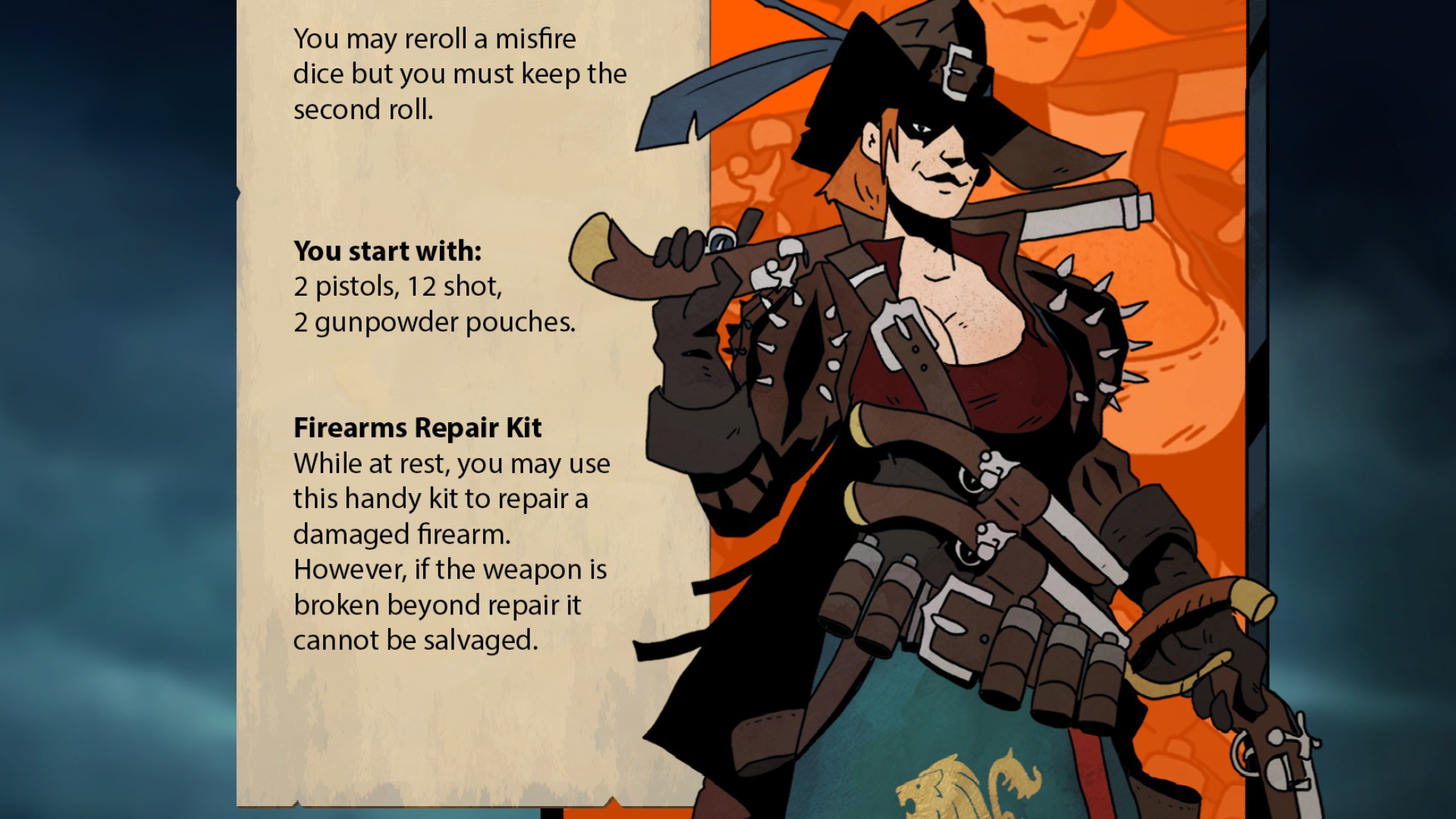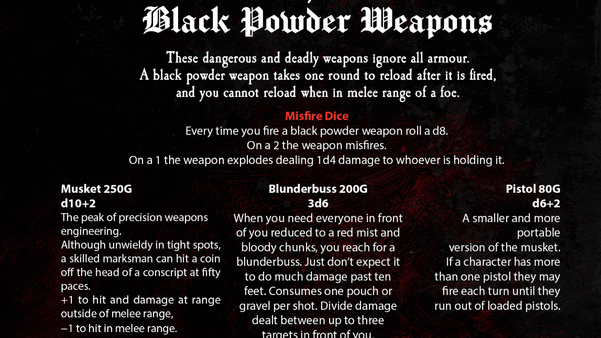 Firearms roll an extra 1d8 on every attack. On a 1, they explode and hurt you, and misfire on a 2. What does misfiring mean? I don’t know. The book doesn’t say. Would you ever use a weapon if you have a ¼ chance of it being useless or actively hurting you? No. No you wouldn’t. Not when you have to take a round to reload them and they don’t do that much more damage than other weapons. They’re a fundamental aspect of the setting and many abilities, but you might well ignore them entirely. The Arquebus, one of the only 4 guns, is even worse. It asks you to roll a d6, explodes on 1-2, and misfires (whatever that means) on 3-4. And it says it deals damage to the "charater" not "character." That misspelling makes it into the book.
