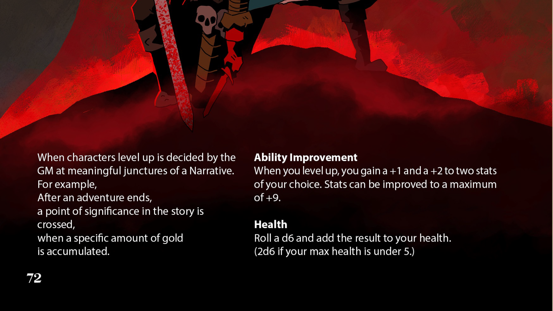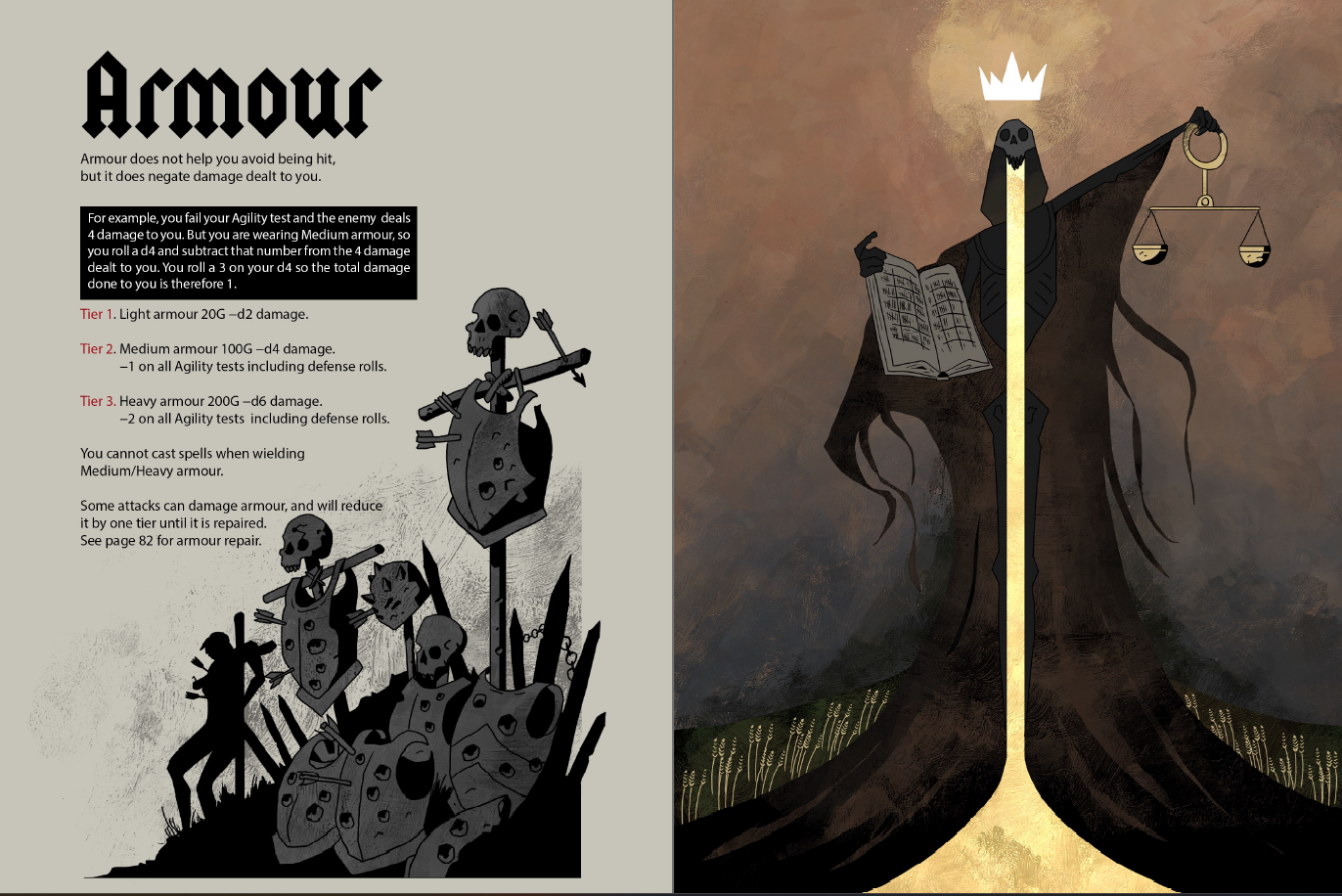 As much as I liked the art, its placement within the book was not consistently complementary to the material. There are more than a few pages which are just art pieces layered against each other or text in ways that don’t actually convey any information. They’re all fantastic, and I don’t know that I can really complain, but it’s hard not to think that they could be put to more deliberative use. This sometimes random approach makes the book harder to navigate, and can undercut its intended tone. For instance, the rules on Cold damage is just sitting in the middle of a lore section for some reason. It’s not the only rule which is oddly placed throughout the book, and therefore going to be hard to remember and find later on.