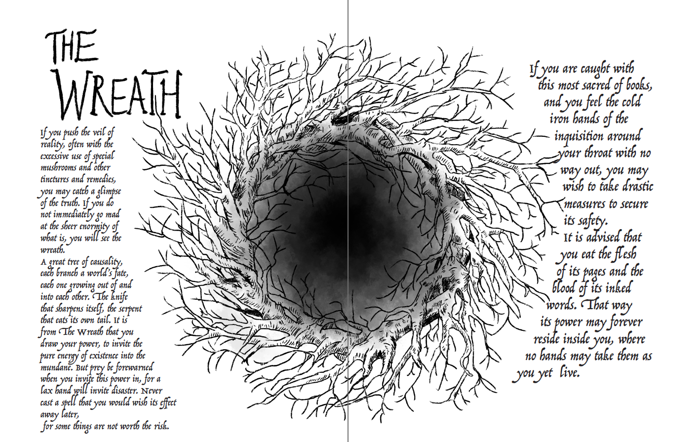 The spells are listed in the book, but also in a separate Book of Spells which is a terrifying, lovely object (that happens to also be poorly written). It feels just like an ancient witch’s spellbook, replete with occult symbols and blood and scrawled ink penmanship on parchment paper. But the actual rules text comes with necessary, unanswered questions. As a few examples: Wound Eater - Target receives all damage dealt to you for d4 rounds. I don’t want a full D&D schematic, but what are the limits here? Can a target be anything? Does it have to be within line of sight? What if the target is destroyed? Obedience: a human target must obey a single simple command. What is a simple command? Does that mean the words you use are simple or the task is simple? How long does it last? Rot and Rust: target loses armor bonuses permanently. Does that mean for the current armor or for all armor they will ever use? It says they lose bonuses, but do they keep armor penalties? Is the armor destroyed or just useless?