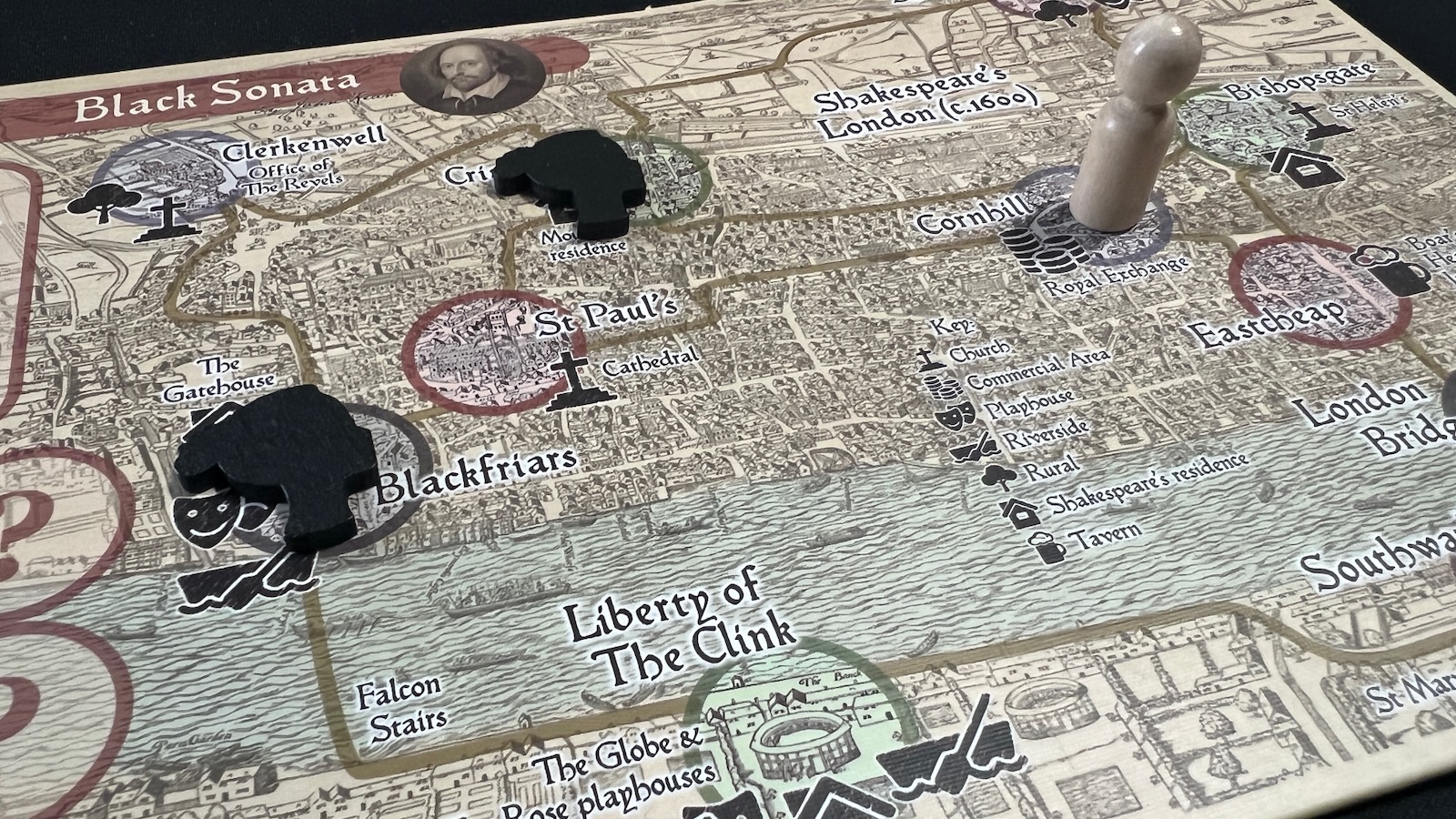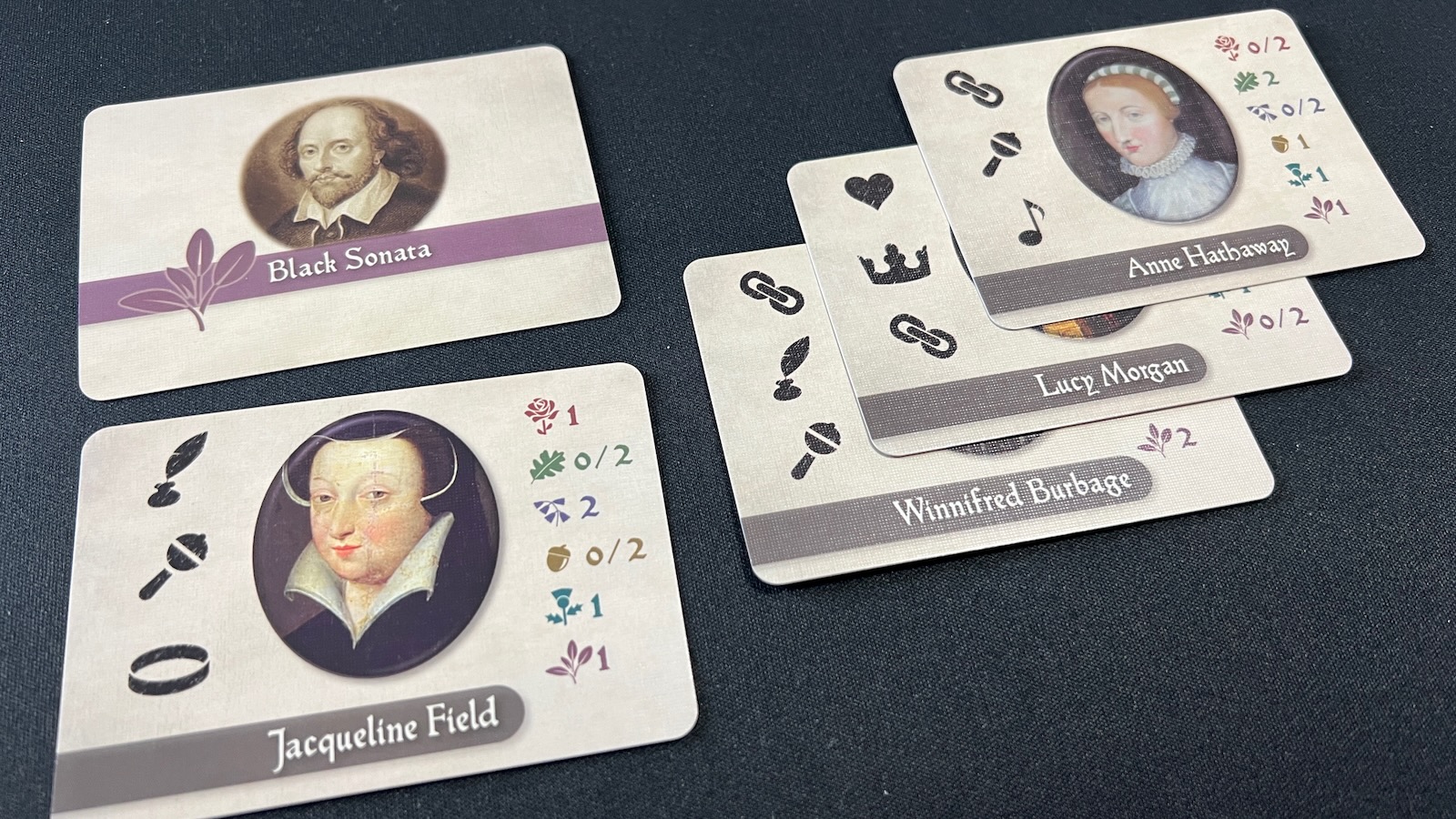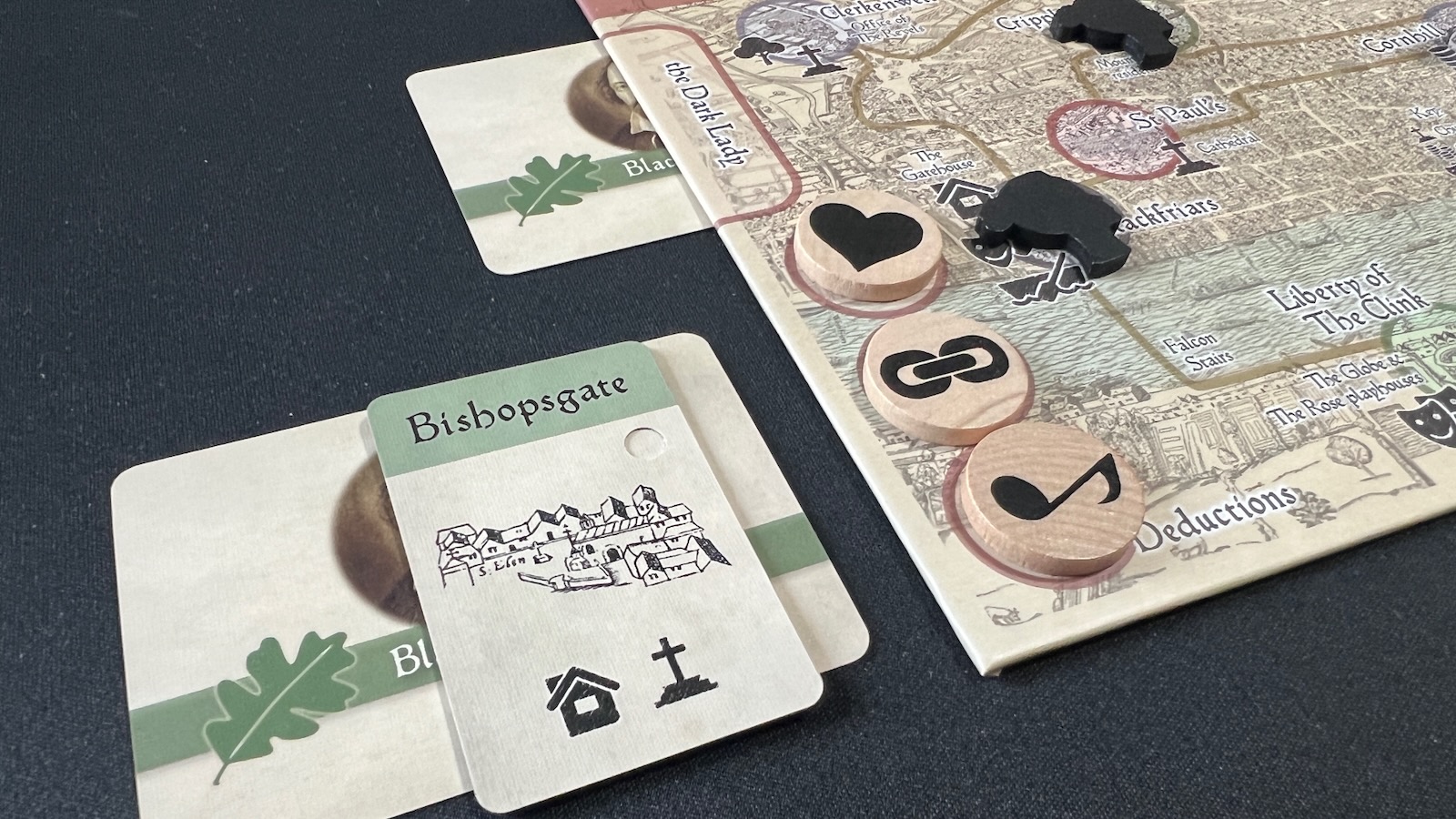 The production of this game is simple and effective. The board is not overly complicated and features a stylized map of London with the game locations printed on top. The cards are of good quality and easy to read. While a few images of the Black Ladies use actual renderings of the subject, many did not have images, so other portrayals of Elizabethan era women were used, so as not to detract from the theme. The trait and Dark Lady markers are made of wood, with the Dark Lady markers cut into the same pattern featured on the stealth cards. The developer provided tuck boxes for the different sized cards and all components fit nicely into the simple organizer.