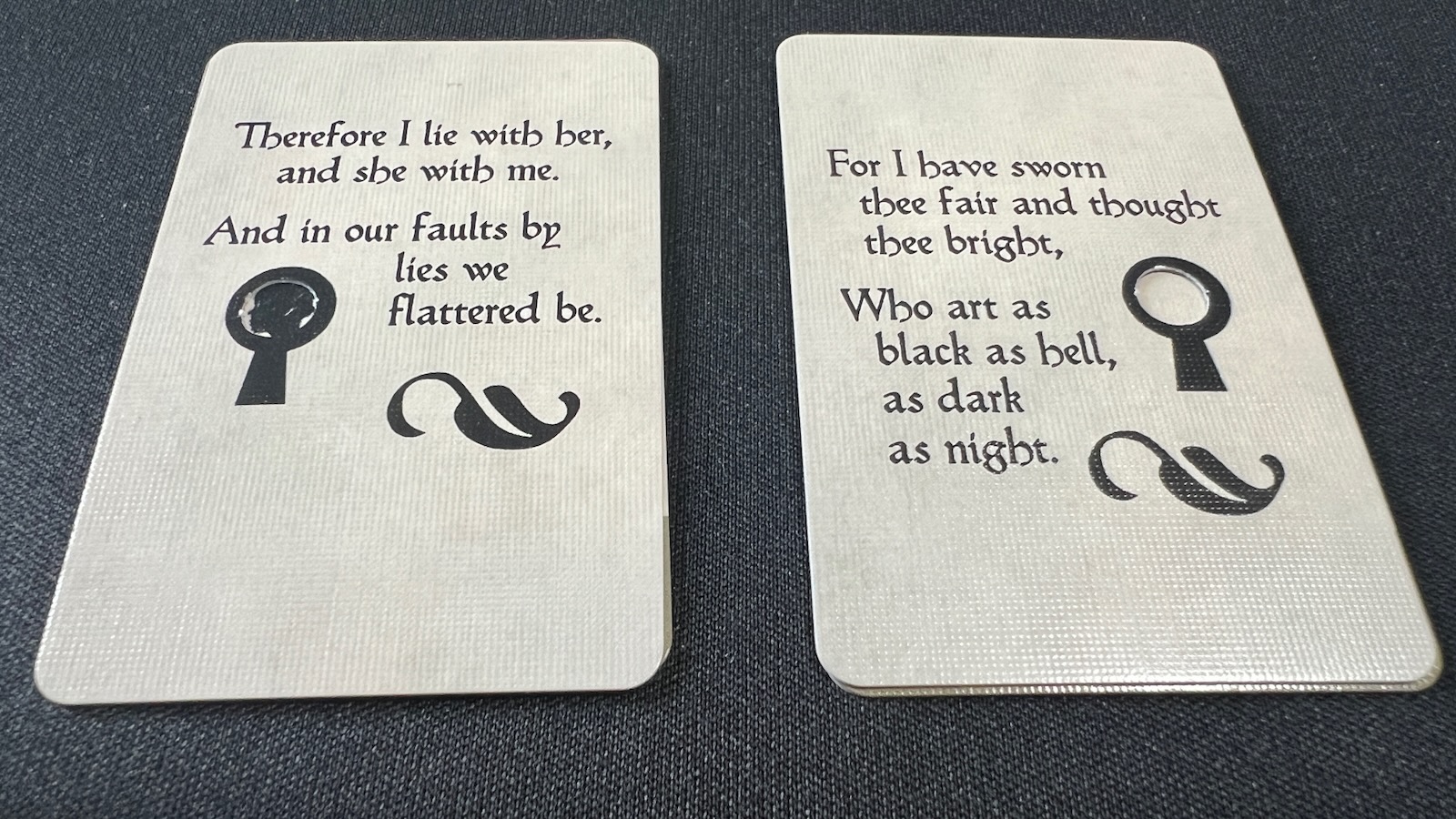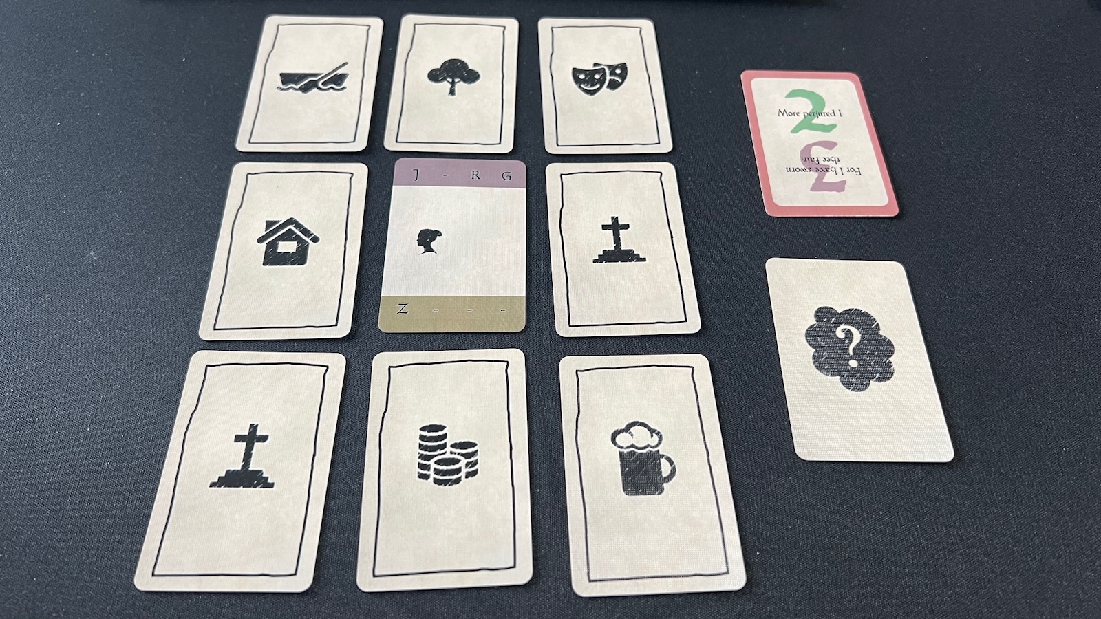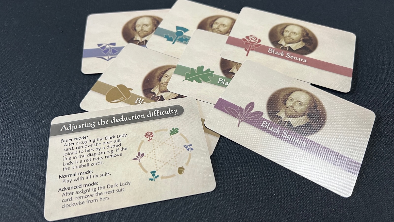 As players collect clue cards, they will use them to deduce the traits of the Dark Lady. Each card has three trait symbols and a key, telling the players how many of these trait symbols match the characteristics of the face down Dark Lady card. Players will need to collect multiple clue cards to narrow down the three symbols unique to the face down Dark Lady. Players are provided with wooden tokens to help them narrow down the three characteristics and a location on the board for their final deduction.