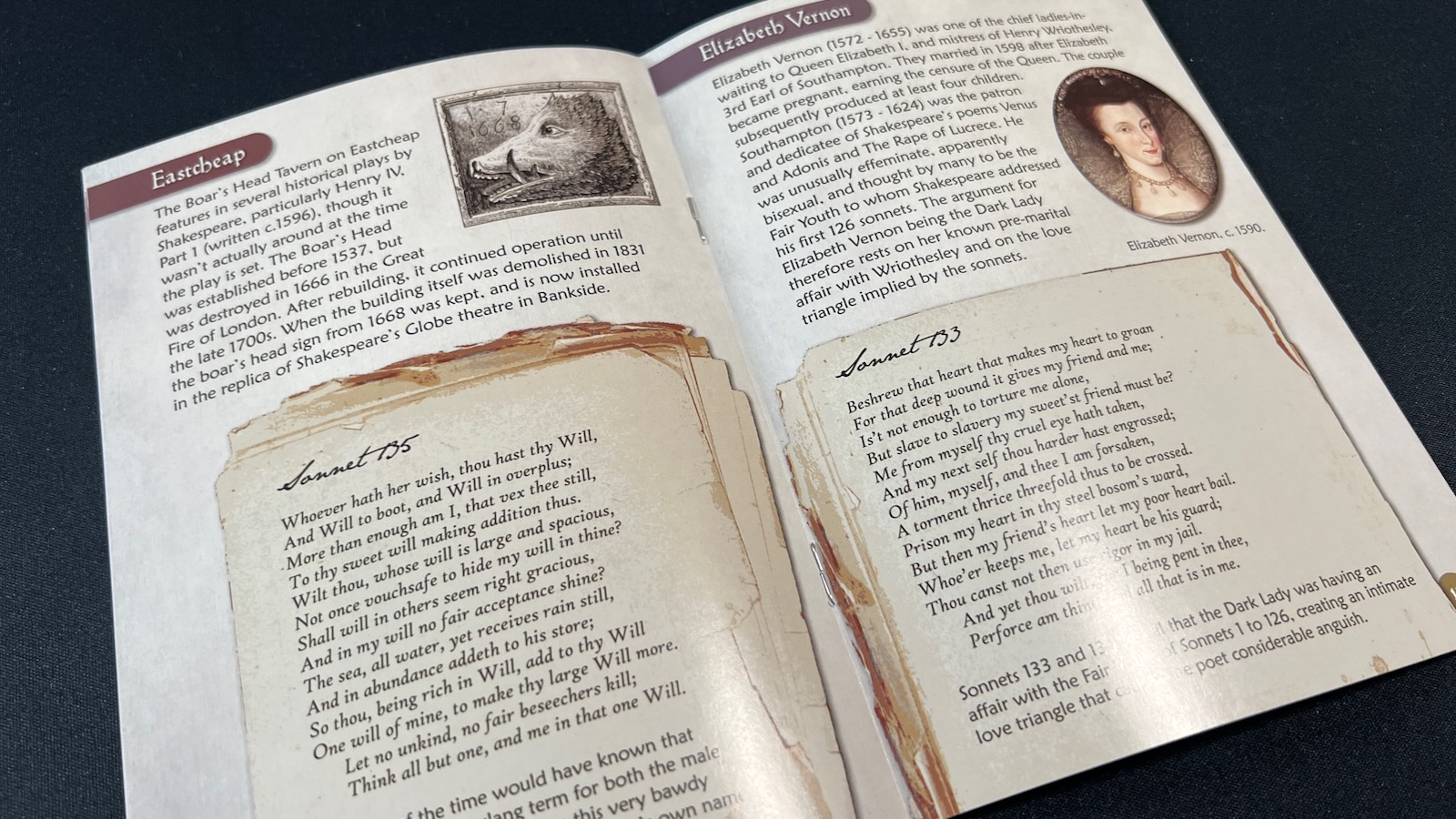 Another pleasant addition to the game is the accompanying booklet titled “Shakespeare’s Long and the Dark Lady of the Shadows.” This booklet helps set the context of the game and includes descriptions of the board locations, text of some of the sonnets that reference the Dark Lady, dossiers on the ladies featured in the game. As a former history teacher and owner of the complete works of Shakespeare, I found this information a fantastic accompaniment to my immersion into the mechanics of the game.