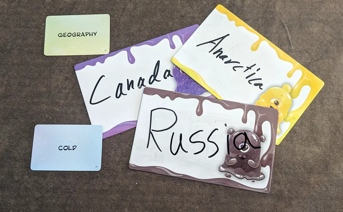 Each round of Blob Party, a player will be given a category at random and then chooses a clue from one of three cards to go with that category. Each player will write down an answer pertaining to the clues in hopes they will match with any of the other players. Each time the players’ answers match they join together to form a bigger blob. Blobs with multiple teammates compare their answers and then choose one answer for their “blob”. If all the players can join as one blob within seven rounds, everyone will win.