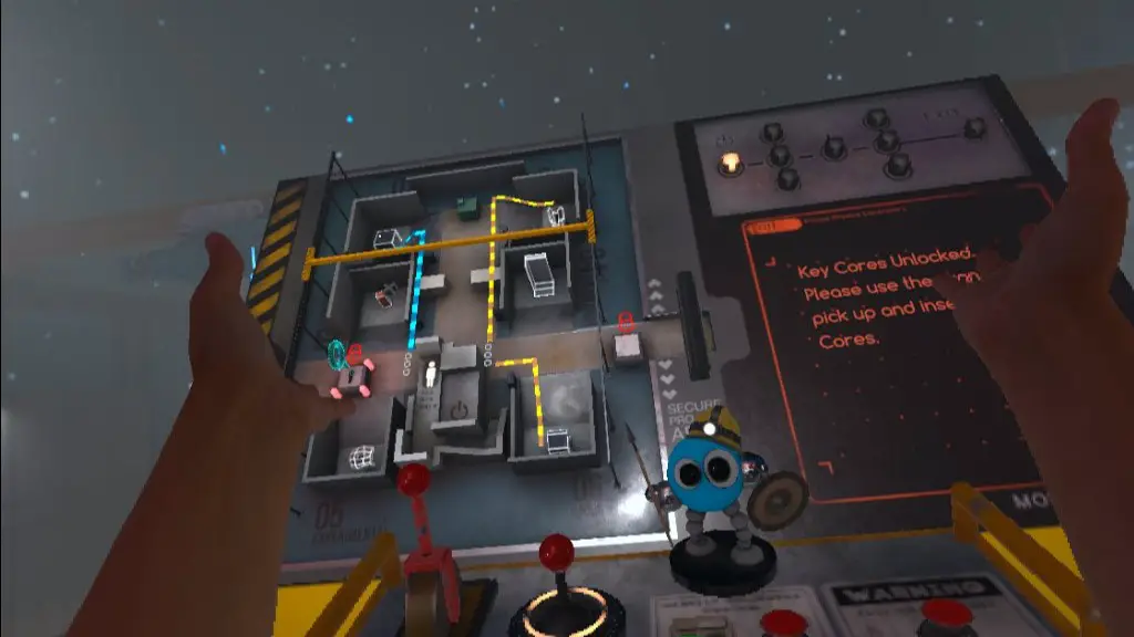 Conversely, the physicality of the game does make for some very memorable combat moments. While the game is mostly a shooter, abandoning melee halfway through the first (and sadly best) level, you still have the option to hit things. For example, I once exhausted a clip just as an enemy was getting uncomfortably close. I panicked and tried to pistol whip the foe, which actually killed them. That’s not something I could do in any other VR game! To test just how far I could push the game’s physics, I took a little blue figure whom I named Sir Elmo with me through the entire game with me. On top of being some adorable, chivalrous moral support, Sir Elmo and I were able to do some pretty cool and interesting things. He blocked a few bullets with his shield, and I was able to use his body as leverage to move some objects and even climb a ladder with one hand. This was just a stupid thing I decided to do and the game not only let me do it, I was somewhat rewarded for creative thinking. Granted Sir Elmo did make some things harder, particularly movement, but I would never abandon him.