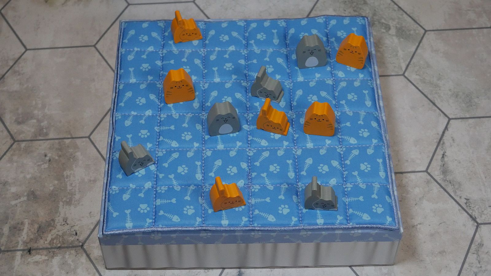 In case you still don’t understand what is going on here, let me break it down in a way a simple human can understand. You start the game of boop. with eight kittens. Players will take turns placing their kittens onto the board (which is actually the back of the box and a bed, but we will get to that later). When a kitten is placed, it will knock, or to use the technical term, “boop”, every other kitten around it, orthogonally or diagonally, one space away, regardless of which team the cat belongs to. If the piece that is booped falls off the board, then it is returned to the supply. If it knocks into an already occupied space, it doesn’t move. If you manage to get three kittens in a row, you remove them from the board and they are replaced in your supply with full grown cats. Cats function the exact same way as kittens with one exception, a cat cannot be booped by a kitten. Once you manage to get three cats in a row, you win the game.