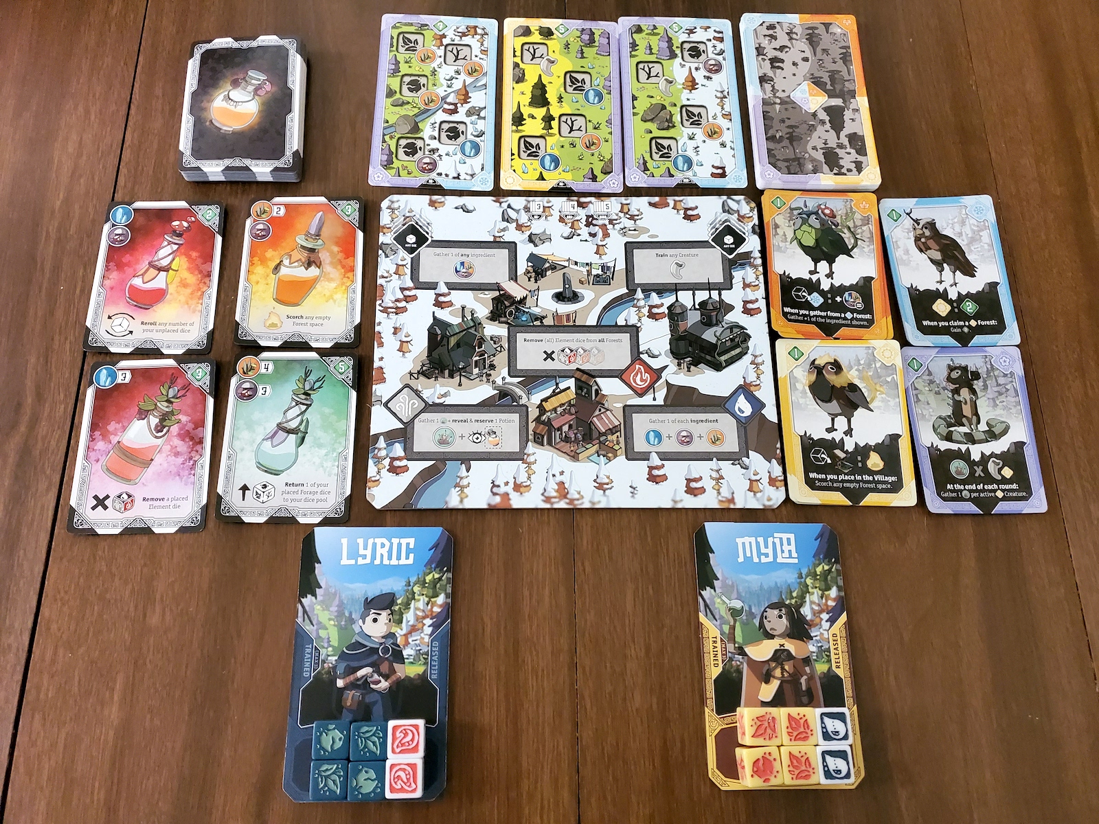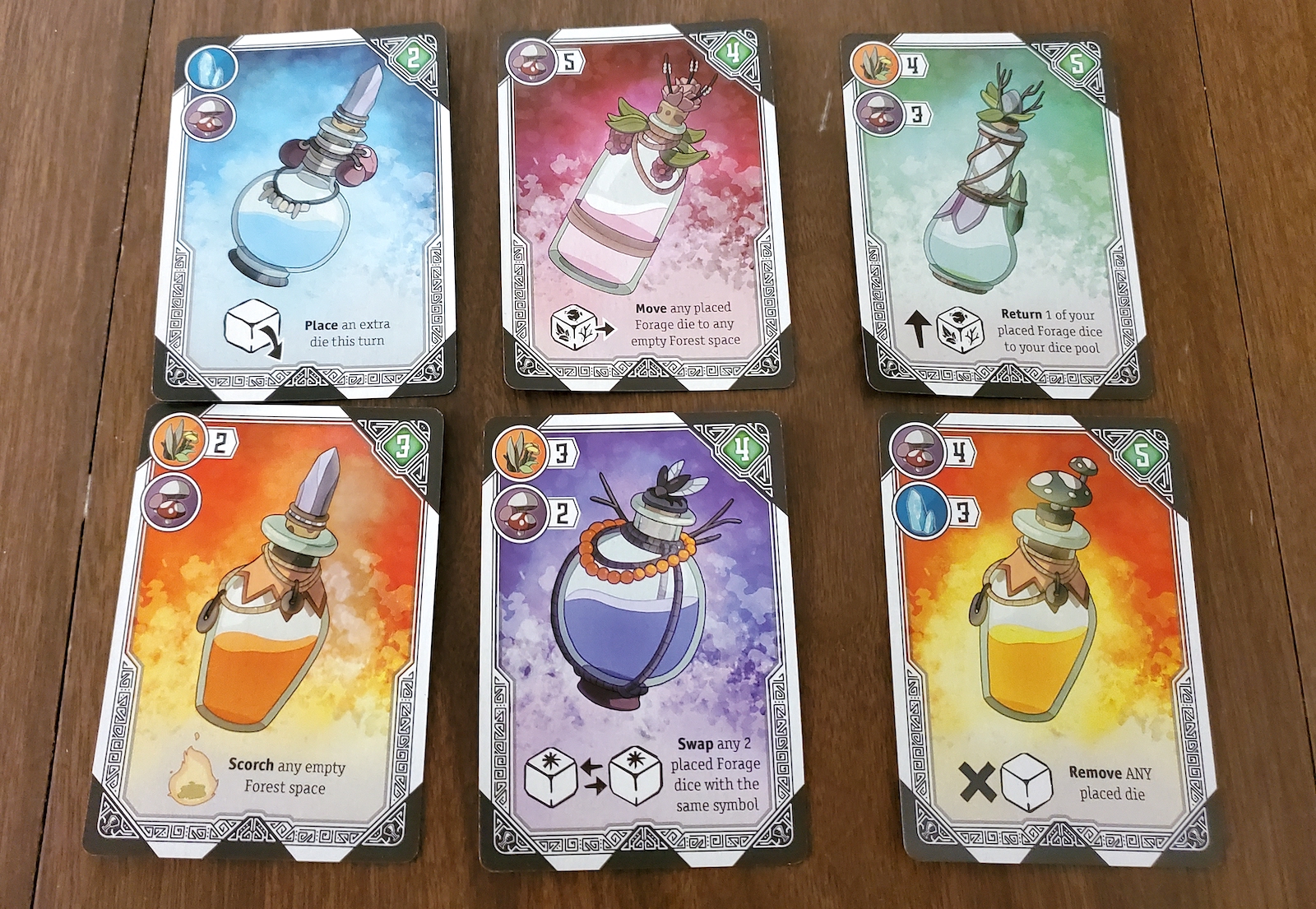 Over the course of 4 rounds, 2-4 players will compete to gain as many victory points as possible. Methods of gaining victory points include claiming forests, brewing potions, training creatures, and utilizing creatures’ special abilities. At the beginning of every round, every player rolls their 4 uniquely colored foraged dice and 2 general elemental dice. Every player will then take turns where they may do any or all of the following in any order: place a die, brew a potion, and/or drink a potion. When a player has no more dice to place, that player passes for the rest of the round. When all players have passed, the round ends. At the end of every round, the village board flips over, the controlled forests are claimed by who controls them (effectively scored and removed from play), the uncontrolled forests are discarded, and (number of players + 1) forests are placed into play.