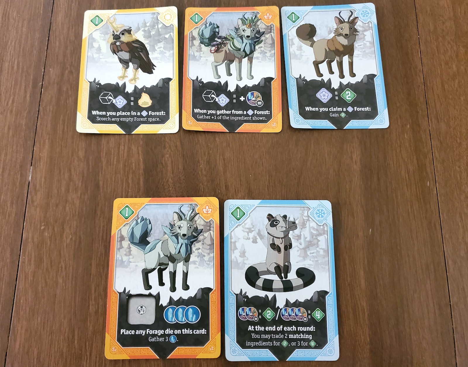 Getting points by training animals is a bit of a crapshoot. Animals are shuffled into piles matching their season/suit, with the top animal only being face up. As there are a host of different abilities animals can have, this can lead to some amazing and powerful synergies – or the animals being basically useless. In one game, I managed to train an animal that scorched forests when I played in spring, one that gave me extra ingredients when I placed a worker/die in spring forests, and one that gave me extra victory points for claiming. All of this put together made it easy to take spring forests and gave me a ton of rewards for doing so. In another game, someone I was playing against managed to train an animal that produced 3 ingredients if any forage die was placed on it and an animal that could convert any 3 ingredients into 4 victory points at the end of every round in the first round. By the end of the game, that was 16 victory points from ingredients from 4 dice placements. While amazingly good synergies are possible, it’s also very possible that the creature on top of the season deck you can train from will not synergize with any creatures you have – or possibly not be particularly good at all. You might never have a shot at picking up a particularly useful creature all game just due to the random nature of the creature decks.