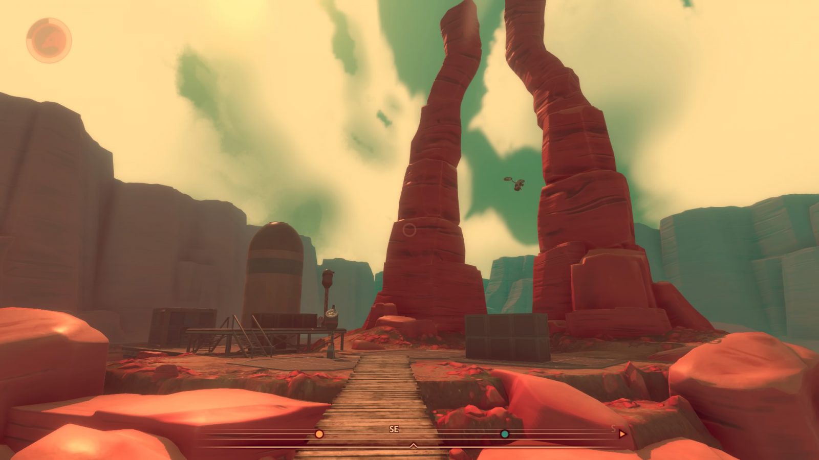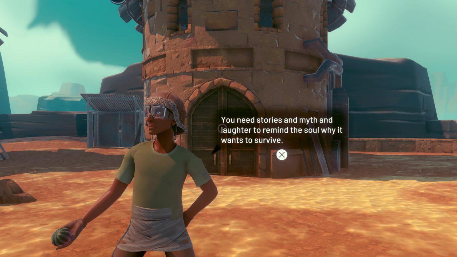 Sarangerai’s culture, like her falcon’s innate wildness, is hinted at, but never really shown. You’ll meet a handful of the folks who inhabited the world before the colonizers arrived, and while some of them are pretty funny, none of them feel fully real. They’re there mostly to tell you about aspects of their culture, but never in a very engaging way. You’ll hear scraps in dialogue if you take the time to talk to them between missions. Some will go into detail about their traditions, their passions, their personal philosophies, but it’s all completely flat in delivery. I never got the sense that I was helping to reclaim a shared culture, as the game says I am. It felt more like getting a history lesson. There’s also no hint of the culture that’s been stolen in the game’s environment, an arid, yet sometimes beautiful, maze of valleys and plateaus.
