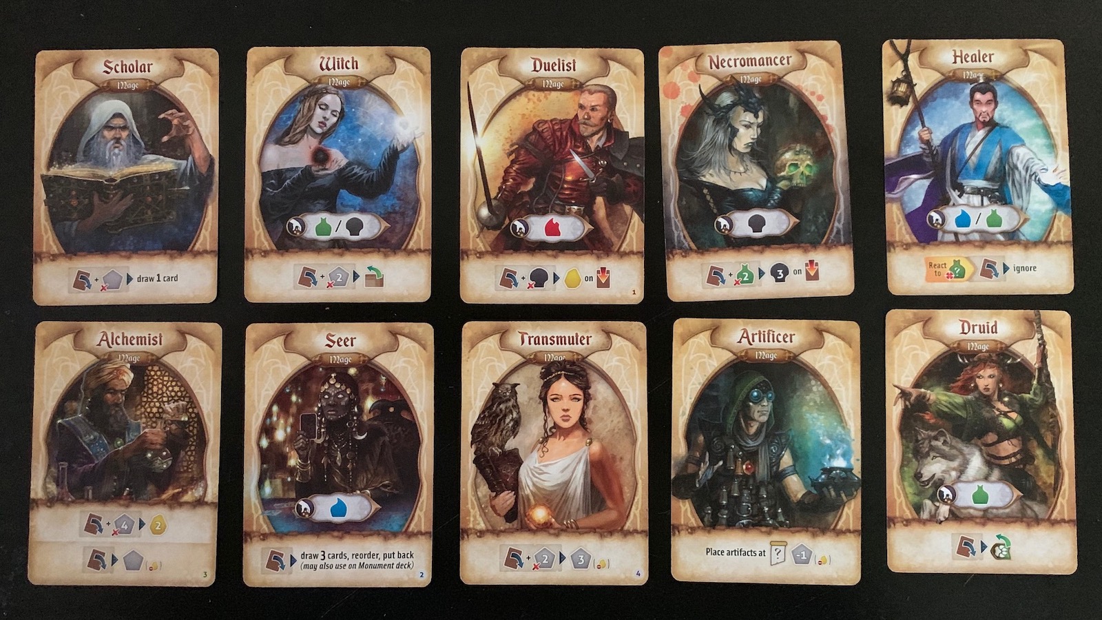 Res Arcana is a 2-4 player Engine Builder game where you and 1-3 other players assume the roles of various Alchemical Mages trying to best use their talents, 8 artifact cards, and communal magical items to control ancient monuments and places of power. The Mage who uses these best will gain the most victory points and win.