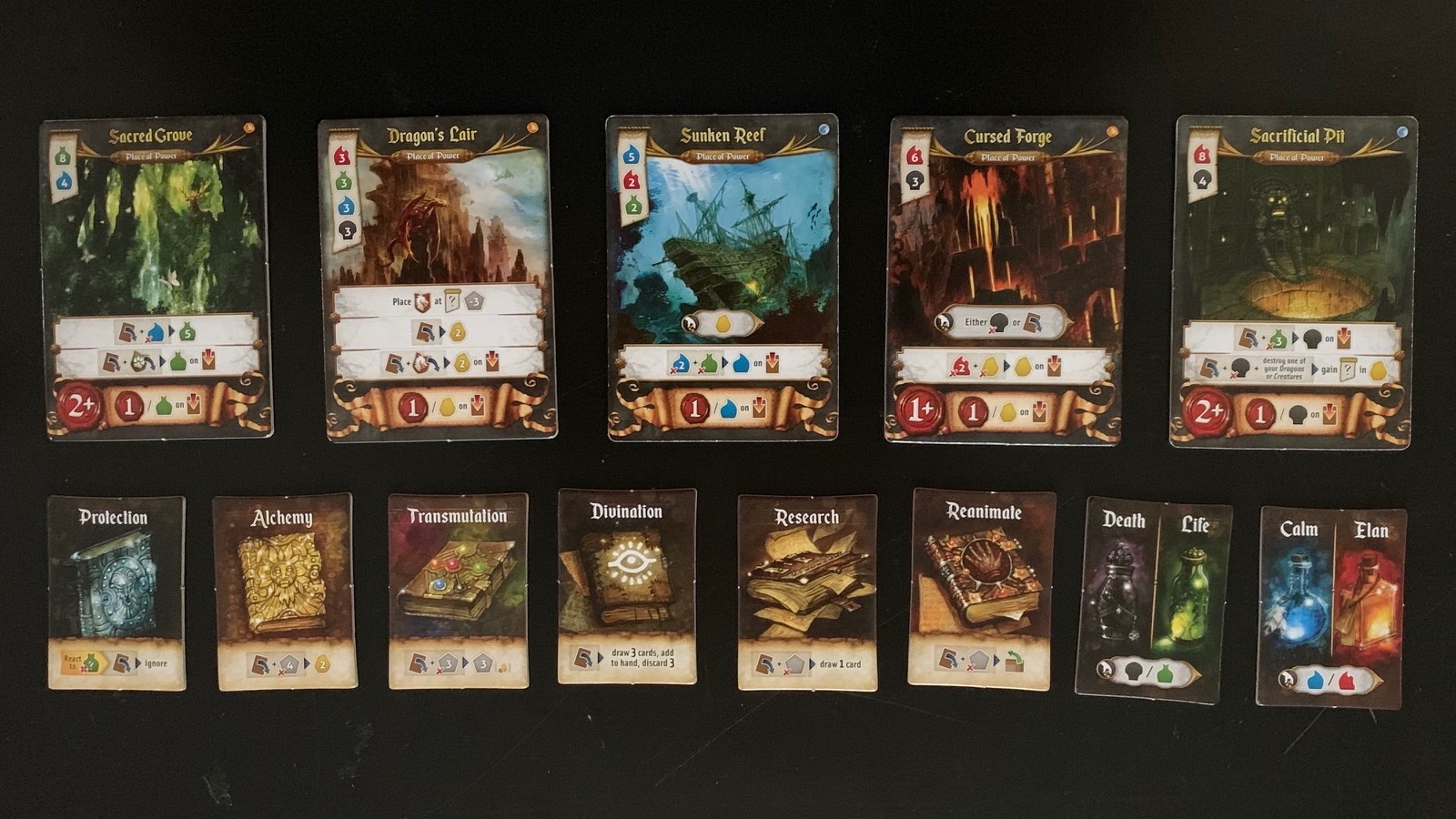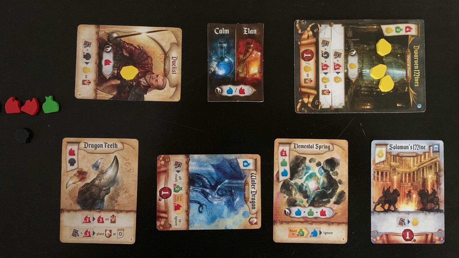 Once you’ve chosen your Mage from the two dealt to you, and the drafting of the artifact cards, players pick a magic item for the round, starting with the last player, and collect the “essences” from these components that the cards generate. The magic items are 8 small tiles that offer low level powers that help you achieve your goals in the round. These are free to take every round, and are returned at the end when a player passes. The essences are five different little wooden tokens that work as the currency in the game. These represent the different elements the Mages control, and use to get their artifacts, monuments, and places of power in front of them to make their moves increasingly potent. These essences are Life, Death, Gold, Elan, and Calm. Elan and Calm pretty much look like fire and water, and I’ll be referring to them as such as you’ll find it difficult to get anyone to call them anything but. I’ve heard other people call them “red” and “blue”, but never Elan and Calm. Each player starts with one of each essence. Every place of power, monument, and artifact has a scroll in the top left corner showing the essence cost to add these to the player’s engine. They will in turn help the player gain more essences quicker to purchase more powerful artifacts and places of power.