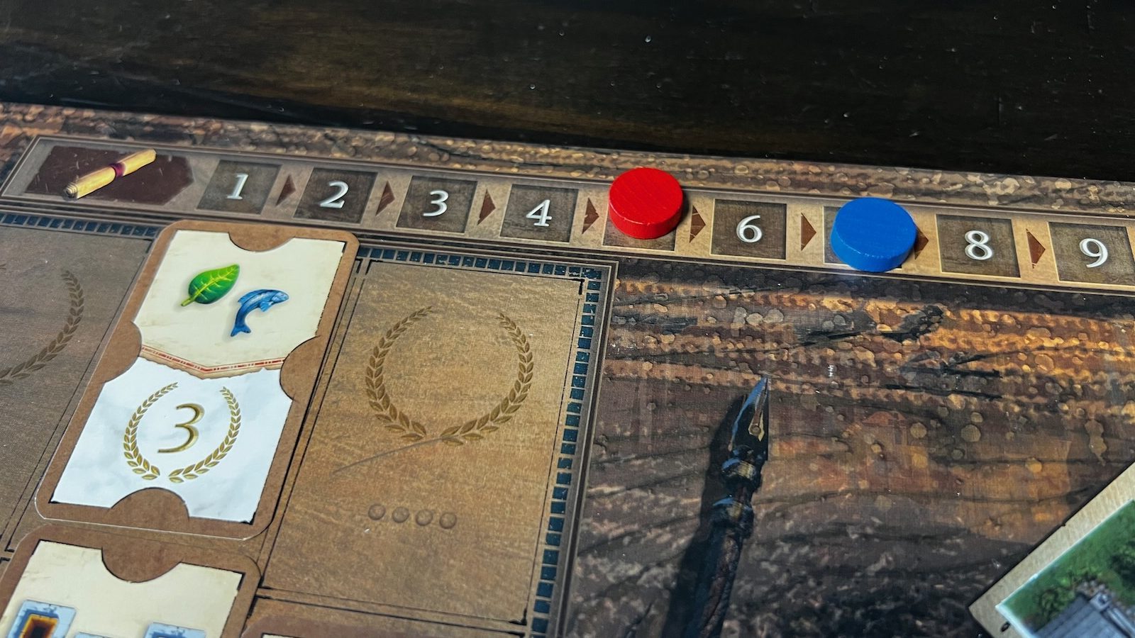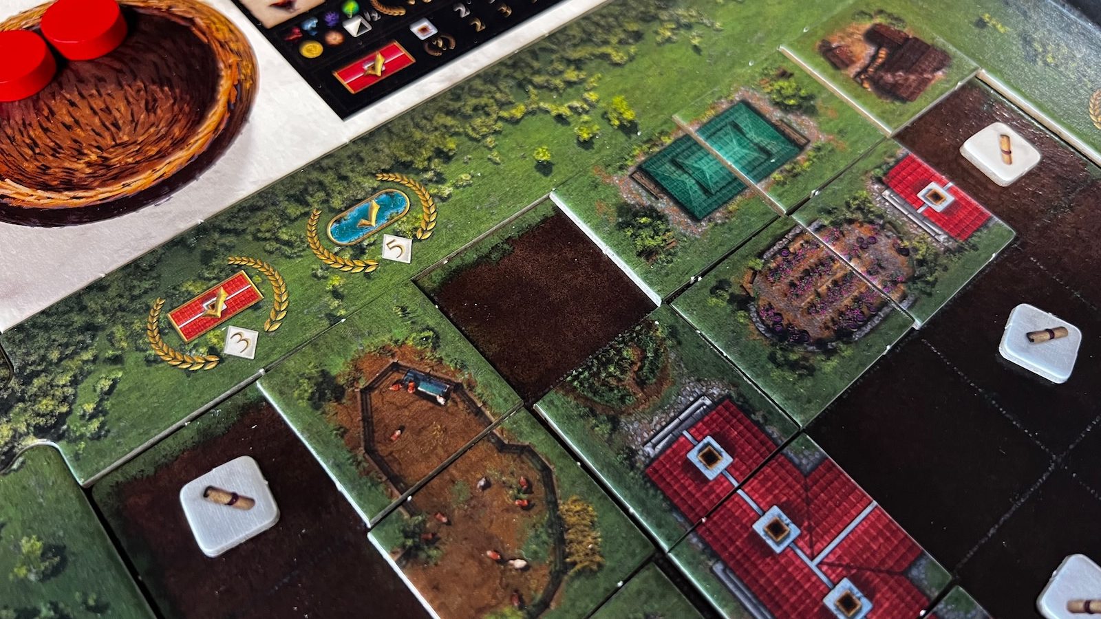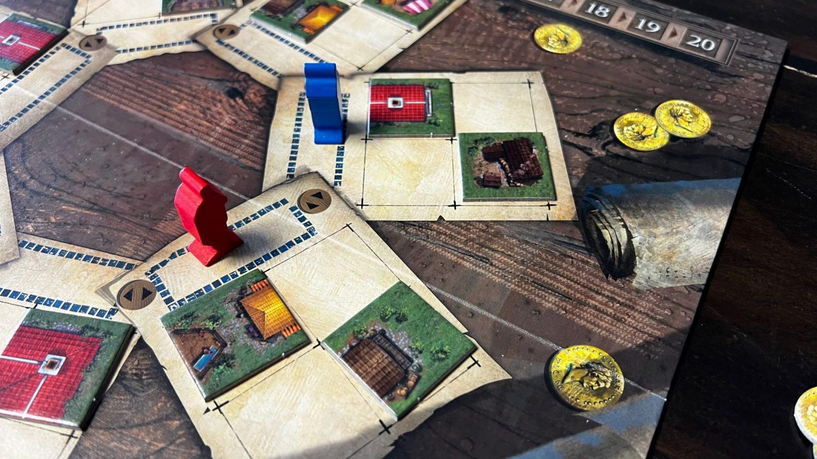 The gameplay, on the other hand, makes up for what the components and artwork lacks. The mechanics of the game are simple: draft tiles, place tiles, gain resources, score points. The strategy, however, is deep and meaty. Players must balance where their pawn ends up each turn to set up their next tile draft. The placement of the tiles balances getting resources early and pushing your luck for more end game points down the line. Playing the reputation track gets important towards the end of the game and choices in the market get slimmer each round. No matter what your strategy is, you have to be willing to pivot to other player choices and what is available on your turn. Trying to pick a tile that you know your buddy wants to fuel his childlike ragefit comes into play as well!