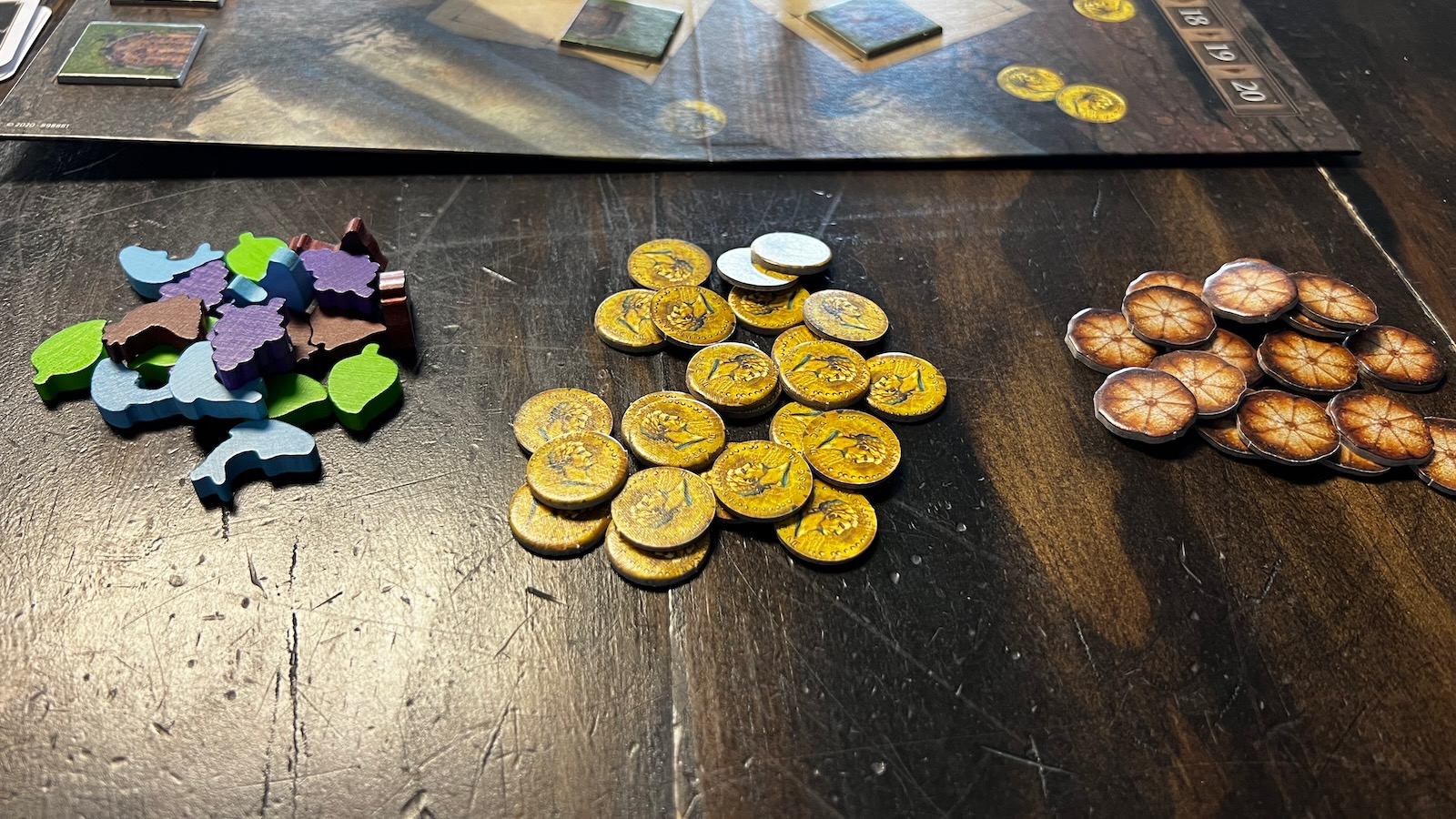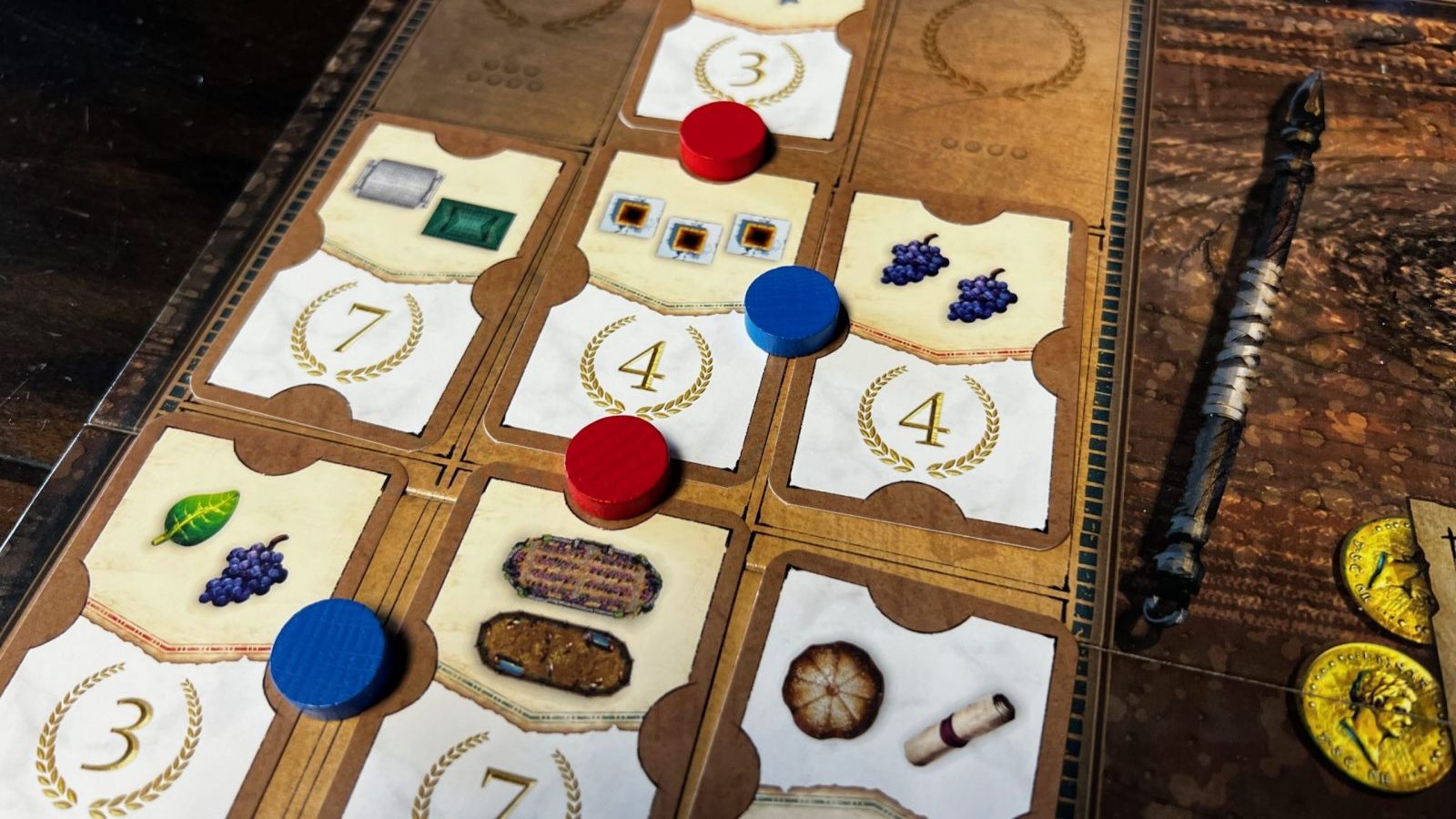 The components of Carpe Diem are what we have come to expect from many Alea games. The cardboard is thin and flimsy and some of the components are very small. The small cards make it difficult to shuffle and keep in the box. I was also not a big fan of using these small cards to keep track of points. The lack of an organizer leads the players to use the many flimsy bags provided to keep everything in place. The resource pieces are a lot of fun. The grape and fish tokens are especially vibrant and playful. The only problem is that there were not enough provided. In multiple playthroughs, we ran out of resource tokens and had to keep mental track of which person had what resources. The updated version fixes some issues with the previous version such as distinguishing different tiles used in different rounds, an updated track system for the drafting phase, and updated artwork on tiles and the main game board. That being said, the artwork is a little dull compared to other games on the market today.