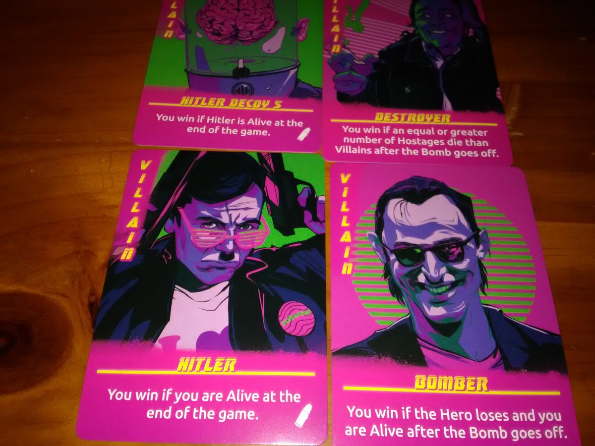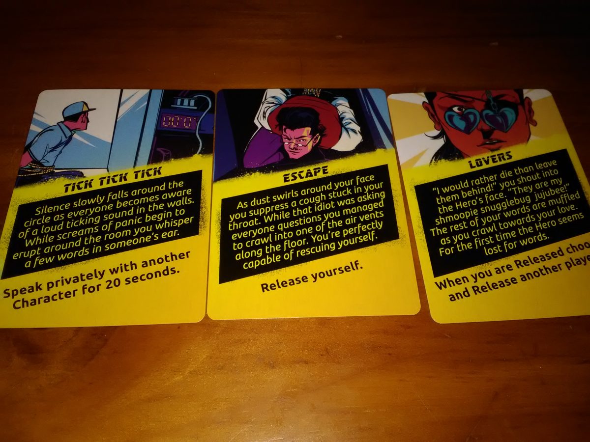 To illustrate what I mean, let me put you in the shoes of the Hero for a second. Two people, for instance, say that they are the janitor. No one else at the table is saying anything, because what could they possibly say? Other Hostages don’t know their loyalty, and Villains have no way to objectively describe for you why they think one person is more trustworthy. Neither do you for that matter. While you are constantly gathering information, none of it is useful for anything. You are going SOLELY off of how effective you think either person is lying, and your ability to detect those lies. The entire time you are making this determination, the other players are sitting around waiting until they get to be a part of the game too. If you do take this game up to the ludicrously high player count of 15, that’s all the more “information” you have to sort through and all the more time that over 10 of your friends have to sit around on their hands.