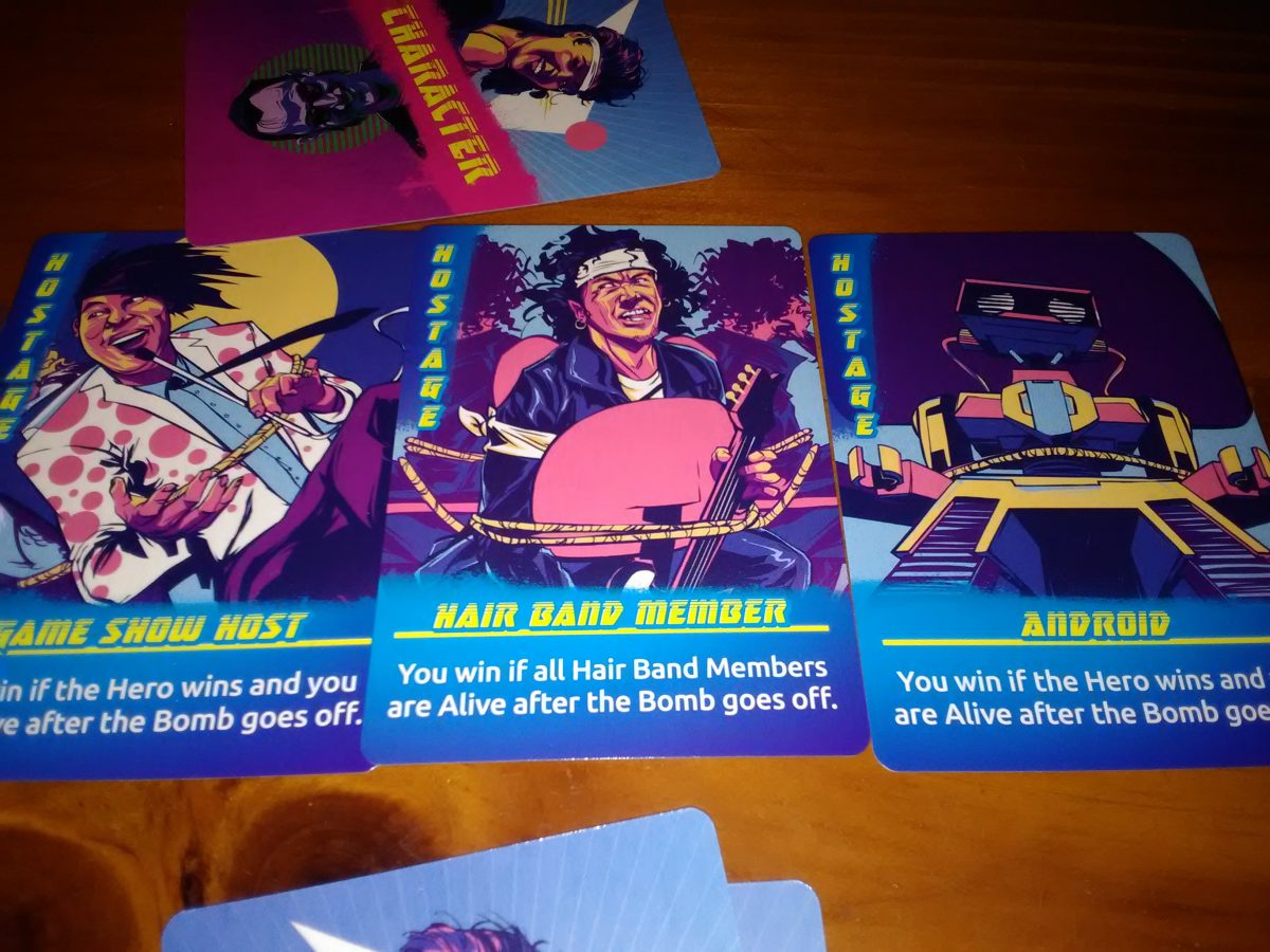 The art takes its cues from what we now pretend was an 80s aesthetic (not a critique of this game as much as the general revisionism we employ about the era). It’s all harsh shadows and loud neon colors that sell a ton of character and amp you up for the fun time you want to have from a game like this. The cards perform their function well, telling you the information you need to know while selling a lot of flavor in the process. I’m sure the temptation to go too far was there, but Andrew Thompson exercised a lot of restraint in an artstyle that could have gotten out of hand. The visuals are likely the highlight of this game, including a variety of characters with inviting details thrown in to give them extra characterization.