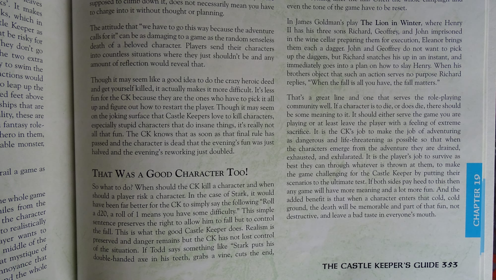 The reason that accessibility is an issue is that the CKG has so much material that it’s frankly overwhelming to try and absorb it all. I’m an experienced gamemaster browsing the book with no specific expectations. Even so, I couldn’t go more than 10-20 pages without needing to stop and process what I’d just read. At times it reads more like a middle school textbook than a game guide. The temptation to jump around is always there, yet the very next paragraph might be the one that brings it into the context of a game or shares some good insight. Someone new to gamemastering diving into the book the way I did will almost certainly be crushed by the sheer volume of it all long before they reach Chapter 14. Even a CK using it for more than a handful of rules at a time should prepare a self-organized solution, perhaps sticky notes or making a spreadsheet. That said, someone who pushes through and learns what the CKG has to offer will be well rewarded.