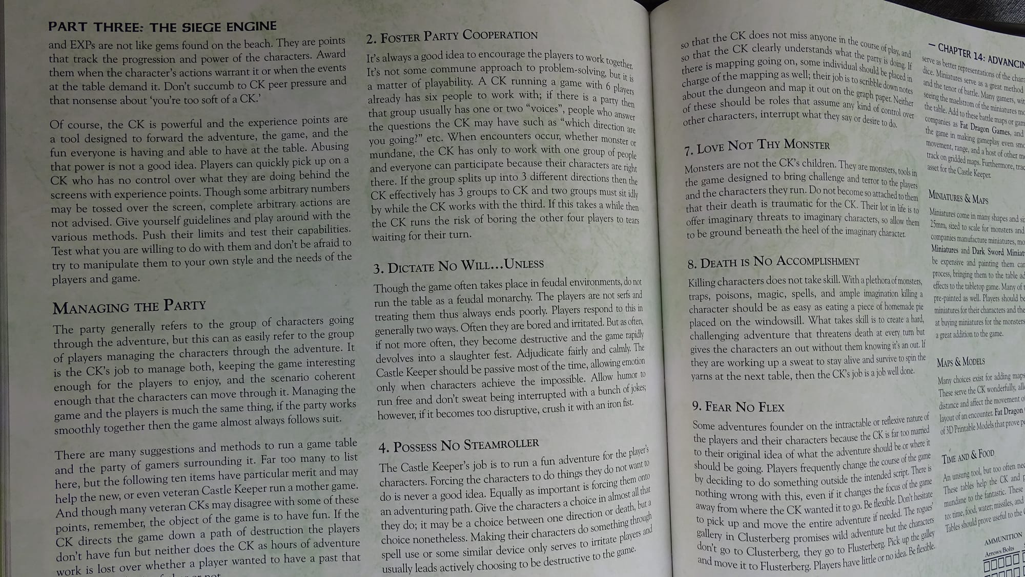 The opening chapter of this section is Chapter 14, “Advancing the Game”. This is mostly tips on running the game. It’s well written, includes some sample play with enough detail to be a sample adventure, and has a lot of good advice for a fledgling Castle Keeper. It’s a tad strange that it’s ¾ of the way through the book when it would seem better served at the beginning. It’s also very general advice, and CKs looking for answers to some kind of table event probably won’t find it here.