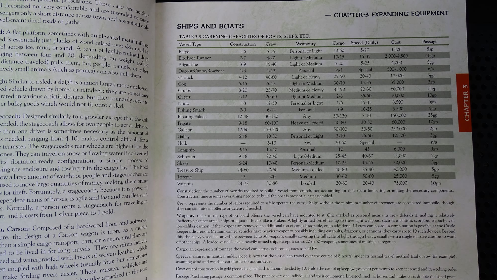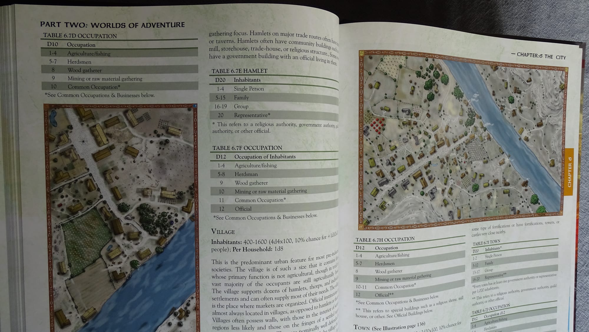 Chapter 5 kicks off the largest of the three parts, labeled “Worlds of Adventure”. Collectively, these chapters cover creating content to run almost any kind of game, and the material they cover is in-depth. As an example, the chapter on cities doesn’t just discuss city size. It goes into types of culture, laws, economics, trade, taxes, religion, why cities are located where they are, how cities are fed at every size, how cities are defended, the names and descriptions of those defenses, and how to have players build them. Every other chapter is given similar levels of detail, even including a multiple-paragraph primer on plate tectonics and what happens to your gear if you spend several days in the pouring rain.