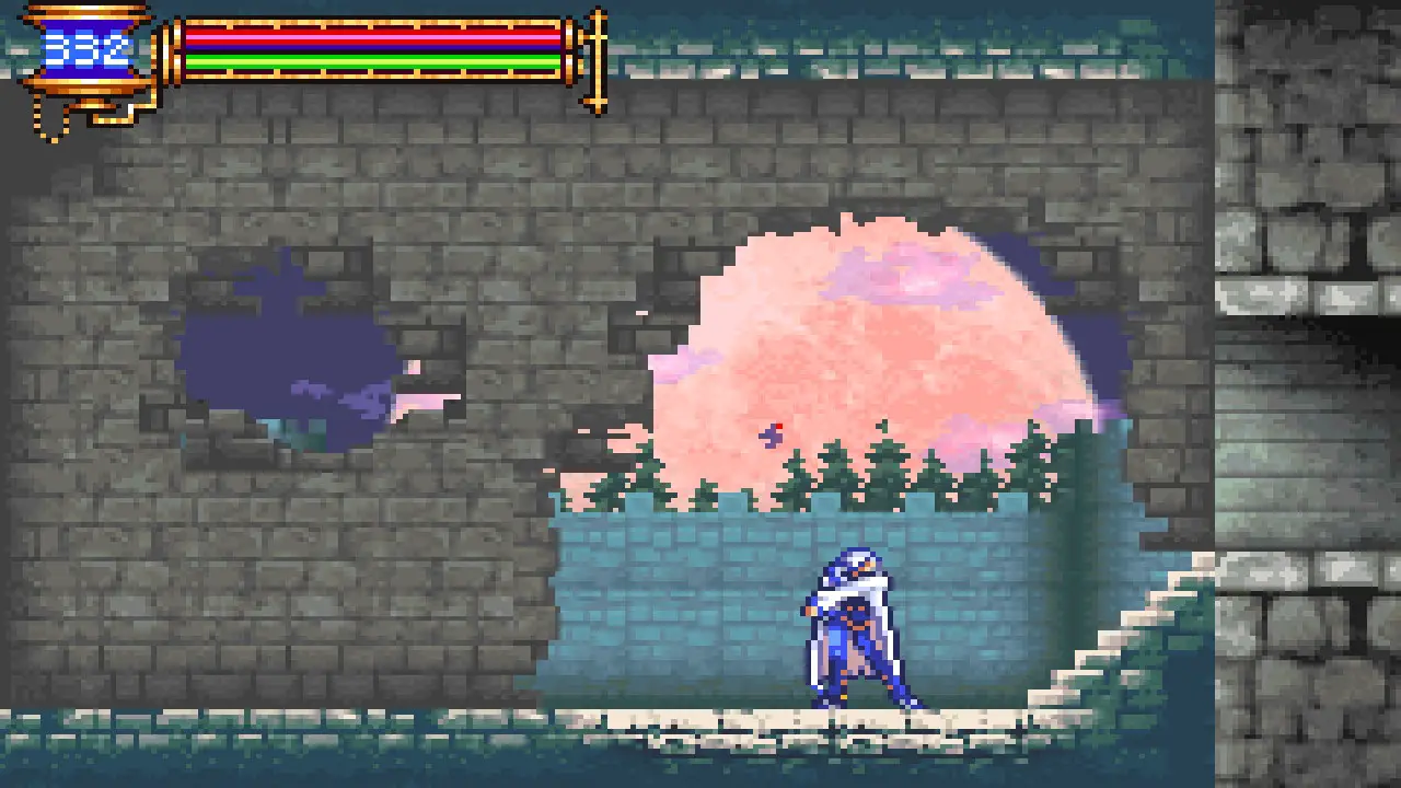 Last in the GBA trilogy is Aria of Sorrow, which changed things up tremendously. First off, your default weapon is no longer the whip; Soma starts off with a Dagger and can equip a variety of weapons as he explores Dracula’s Castle. If you’re familiar with Bloodstained’s Shard system, you’ll recognize an early version of that with Souls. Dropped by enemies, you can equip up to three souls at once with Red Souls replacing sub weapons, Blue having passive effects as you hold R, and Yellow granting stat buffs like being stronger against poison or having lower prices at shops. It can be a bit frustrating to be able to equip only one of each type, but this system allows you to greatly customize your playstyle to your liking. In my opinion, AoS also has the best story and world of the three.