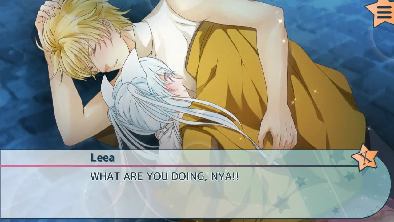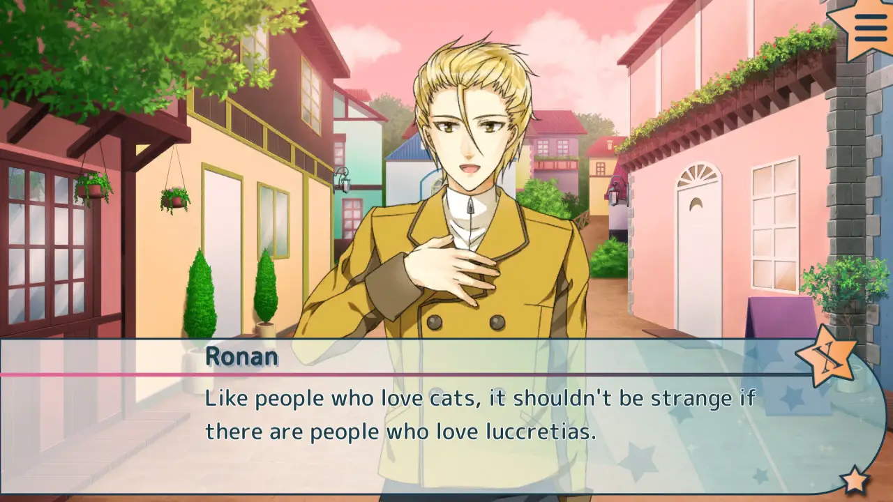 As this is a visual novel, there are different routes you can take, with the two main routes diverging based on choices you make in the beginning. Will you reject your Luccretia heritage and try to revert back to human form, or will you embrace your inner catgirl and save the day? Apologies if I make this sound more exciting than it is, but this is actually a romance visual novel, not a politically charged action-based one. There are tons of times where the situation between the duo is tense due to the fact that they’re on the run, but then it cuts to Lilia being immature and ogling Ronan while musing on her situation (or vice versa). The tone of the story feels very inconsistent throughout the chapters, especially if you’re choosing flags that cause your relationship to increase with Ronan.