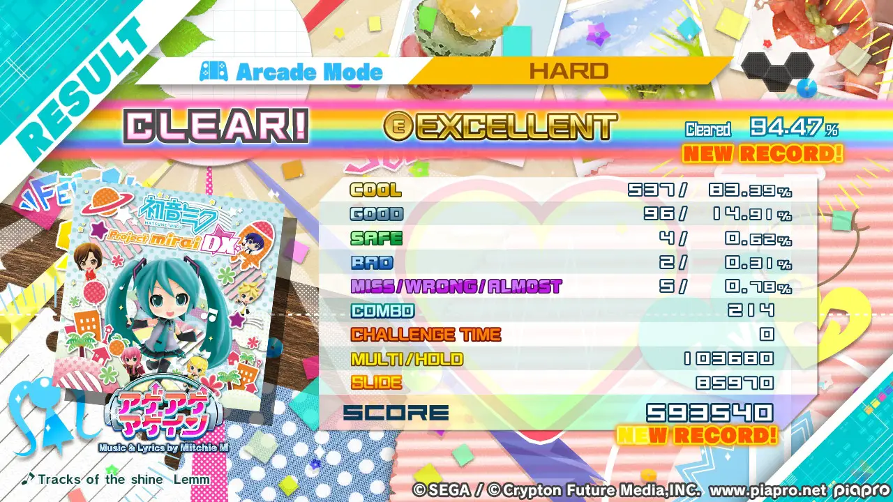However, the biggest addition in Mega Mix is the Mix mode, which can be played from the beginning. It utilizes two Joy-Con as you swing both of them and hit notes using the ZL and ZR buttons. It consolidates the button presses as you only have one big button on each hand to hit, and also need to follow holds by controlling an on-screen trail. For the rhythm game fans out there, it feels like a half-circle version of Wacca, and in theory this is an innovative mechanic that does breathe a little bit of life into the series. However, in practice it becomes a tacked-on extra mode that you’ll probably try out for a few songs and then ditch for the classic Arcade mode. You see, unlike the Arcade mode where you can freely customize button mapping and inputs to whatever you see fit, you can only use the default control scheme with Mix mode. That means you’re stuck using the ZL/ZR buttons and flailing your arms around in order to play, whereas it could have been much better to utilize face buttons. (Granted, with a new Switch firmware update, you can map different buttons, but it’s a hassle especially since these remaps affect the entire console, not just a certain game.) This unfortunately means my fingers kept getting cramped after playing a couple of songs on Normal.